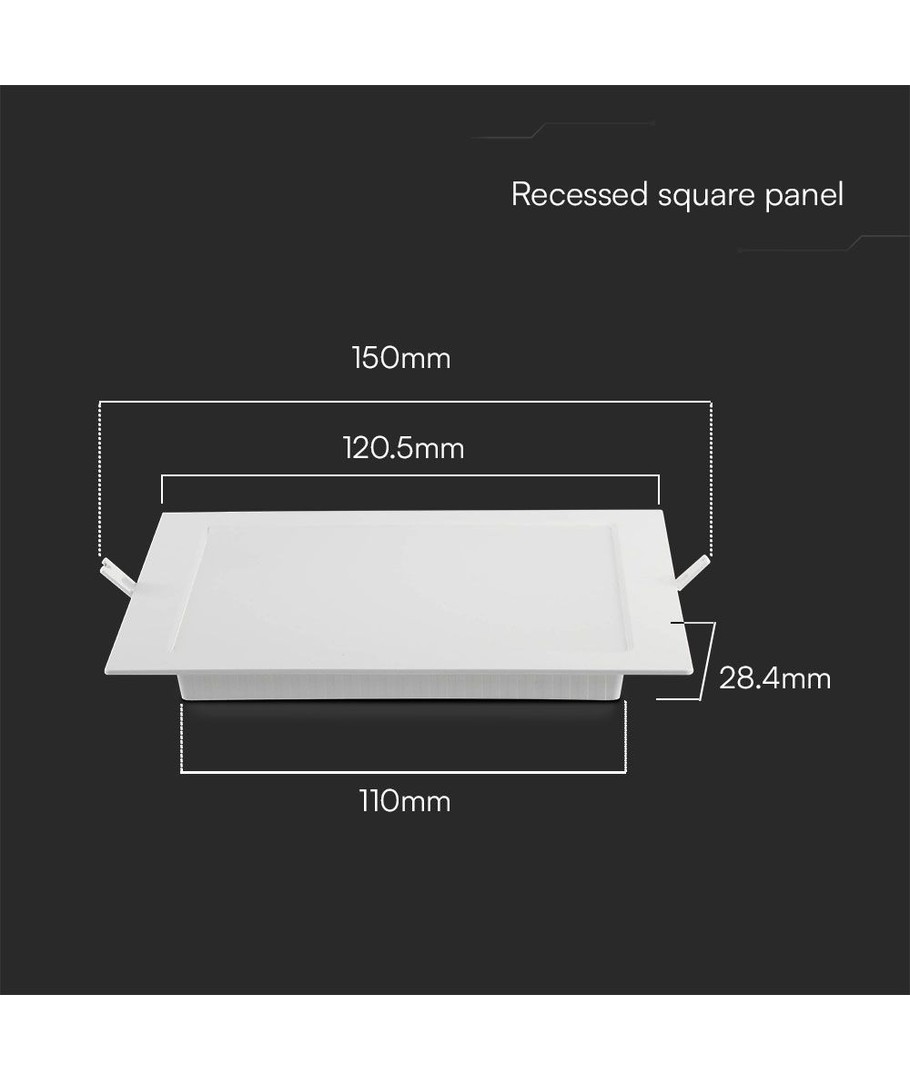 Panelet har integreret lyskilde og en kompakt konstruktion på 120,5 x 28,4 x 120,5 mm. Bemærk, at produktet har en IP20-klassificering, hvilket gør det uegnet til fugtige eller våde miljøer.