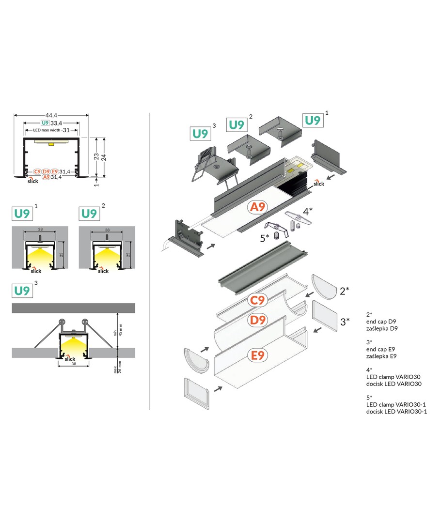 Anodiserad, infälld, LED-skena