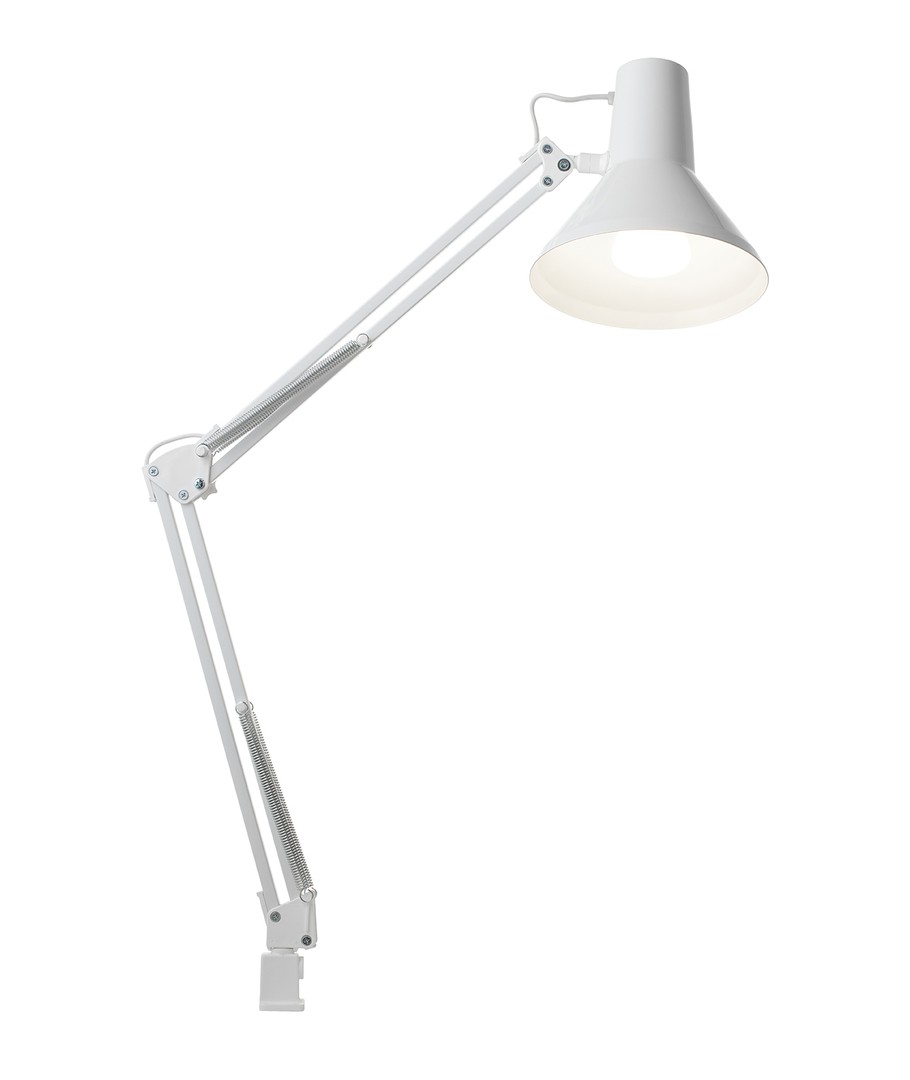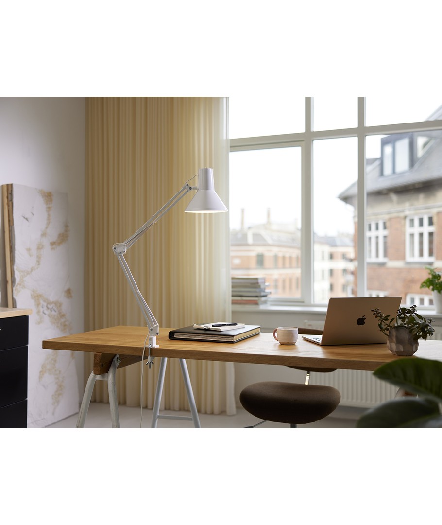Jensen arkitektlampe i hvit fra Nielsen Light er den originale, klassiske arkitektlampen med 4 kraftige fjærer og hode i ett stykke metall. Lampen leveres inkludert bordklemme og veggbrakett, slik at den er enkel å montere på skrivebordet eller på en vegg.