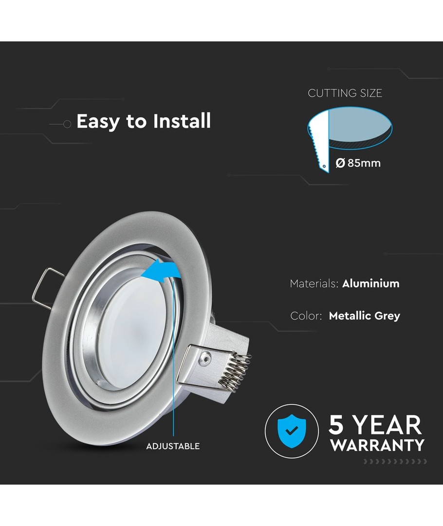 GU10 indbygningsspot, rund - Sølvgrå, Ø95mm, IP20 indendørs, uden lyskilde V-TAC Udvid