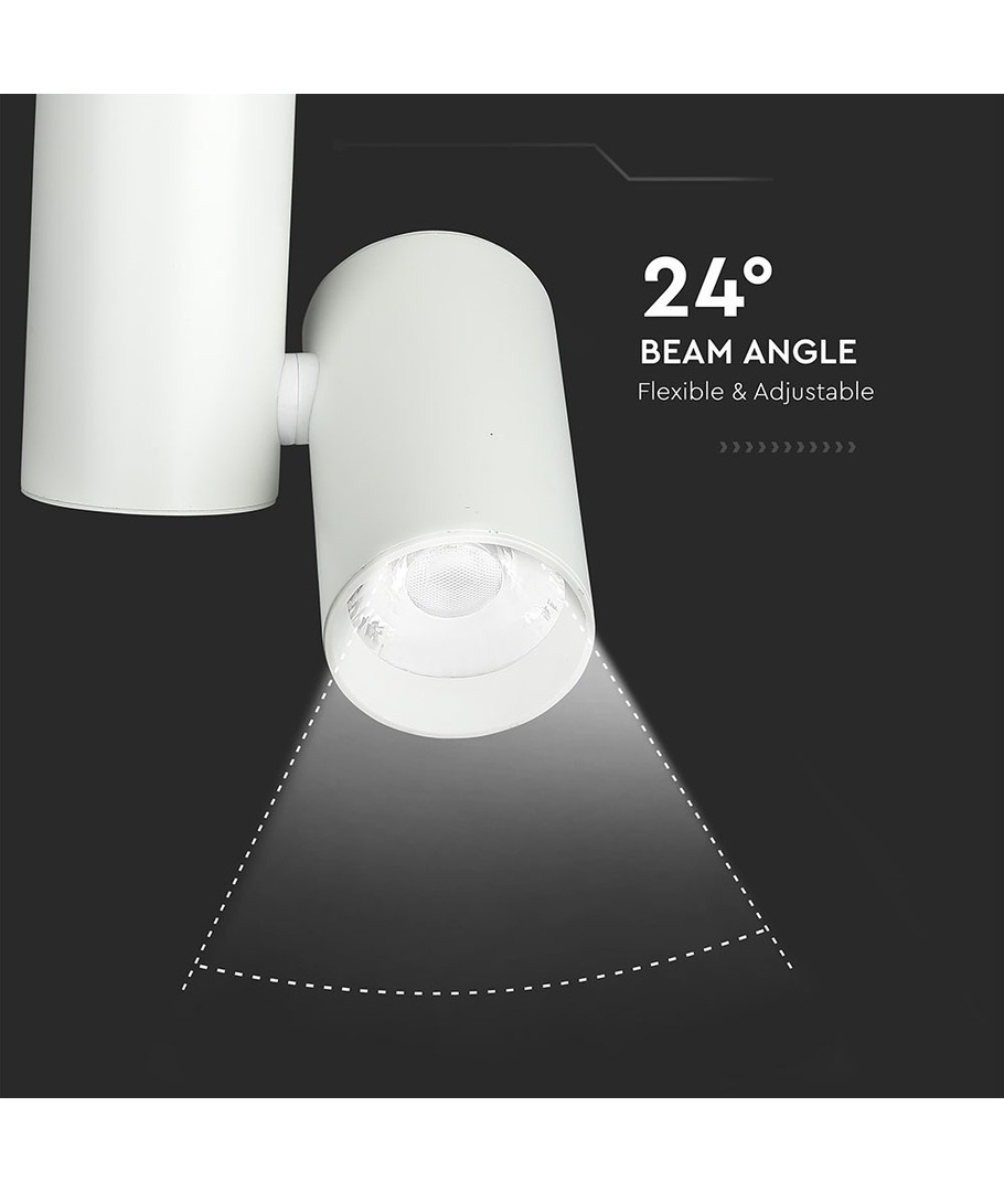 Ce spot LED sur rail 30W est conçu pour fournir un éclairage optimal avec un flux lumineux de 2700 lumens. Avec un faisceau focalisé de 24 degrés, il assure un contrôle précis de la luminosité, idéal pour de nombreuses applications. La haute qualité de lumière est soutenue par un indice de rendu des couleurs (IRC) de 95-99, offrant une lumière vive et naturelle qui met en valeur toutes les couleurs de manière éclatante et dynamique.