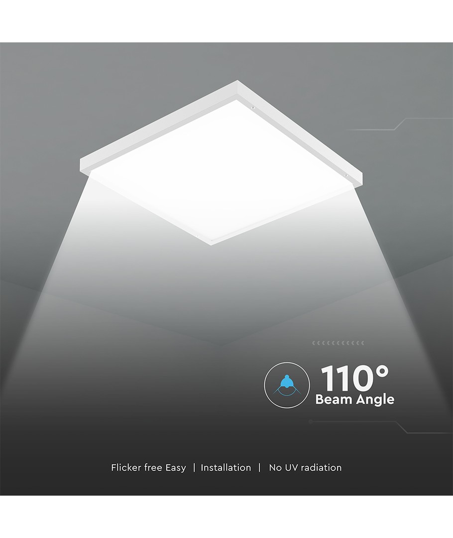 Spécifications :Le panneau offre une haute efficacité avec 120 lm/W, assurant une solution économique en énergie tout en fournissant une lumière puissante. La large diffusion de 110 degrés garantit une répartition homogène de la lumière dans la pièce.
