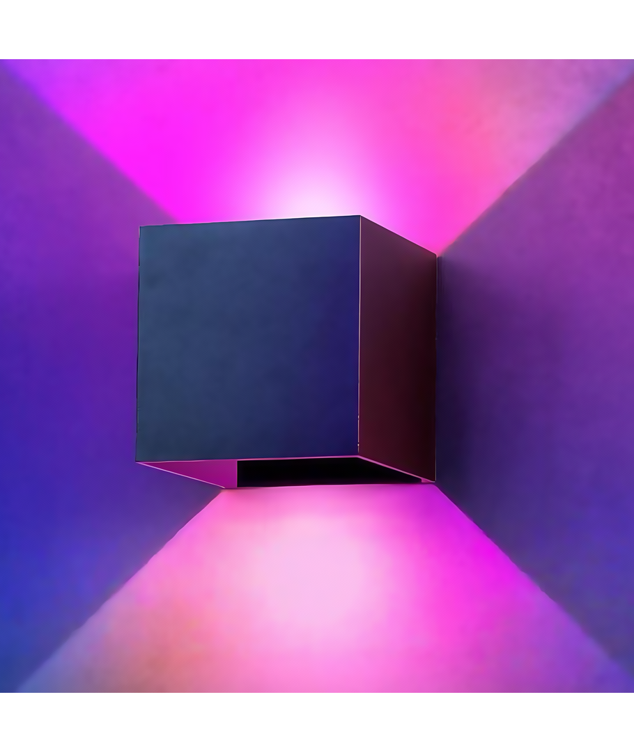 La lampe murale LEDlife RGB+CCT CUBIC 6W est une lampe moderne et élégante, noire et carrée, qui peut être utilisée à la fois à l'intérieur et à l'extérieur avec une classification de protection IP65.