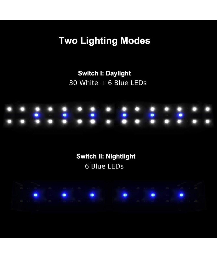 La combinaison des LED blanches et bleues offre un aspect naturel, tout en renforçant les couleurs des plantes et des poissons.