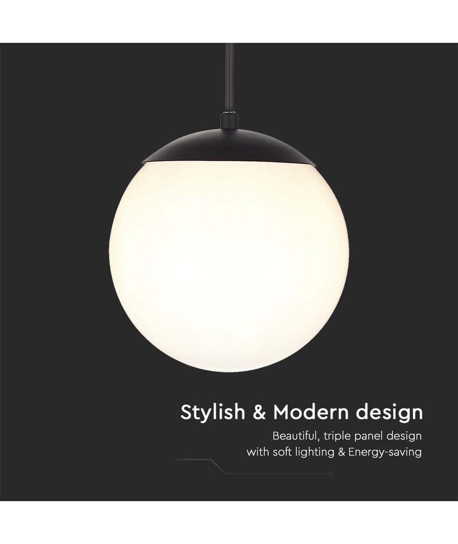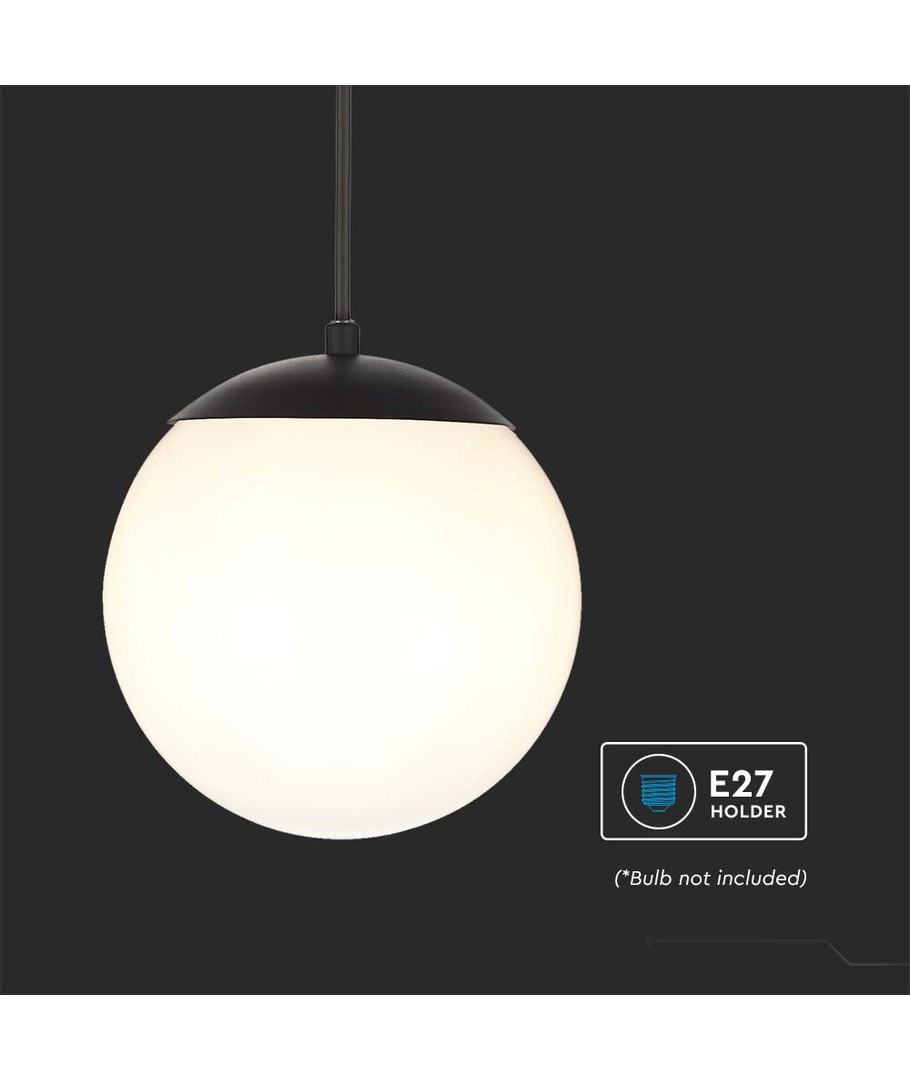 Lampe suspendue au plafond au design noir mat avec globe en plastique opale, idéale pour une utilisation en extérieur.
