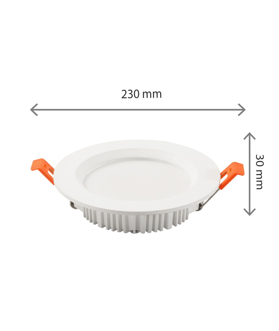 Avec des dimensions de 230 x 30 mm et un diamètre de découpe de 190 mm, ce downlight s'intègre parfaitement dans un intérieur moderne. Son design rond et blanc en fait un ajout discret à tout plafond. Le design encastré signifie qu'il n'est pas nécessaire d'ajouter une source lumineuse externe.