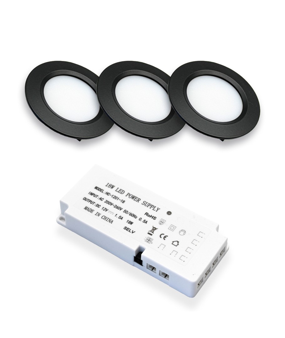 Avec cet ensemble, vous obtenez 3 spots meuble Reco68 noirs, ainsi qu'une alimentation 12V DC, pouvant accueillir jusqu'à 6 spots meuble.