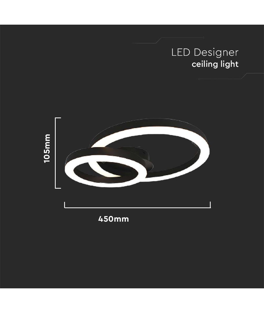 La lampe est conçue avec un aspect moderne et épuré. La forme à deux anneaux offre non seulement une expression esthétique, mais assure également une répartition homogène de la lumière. Avec ses dimensions de 450 x 105 x 300 mm, elle s'adapte parfaitement aux grands comme aux petits espaces.