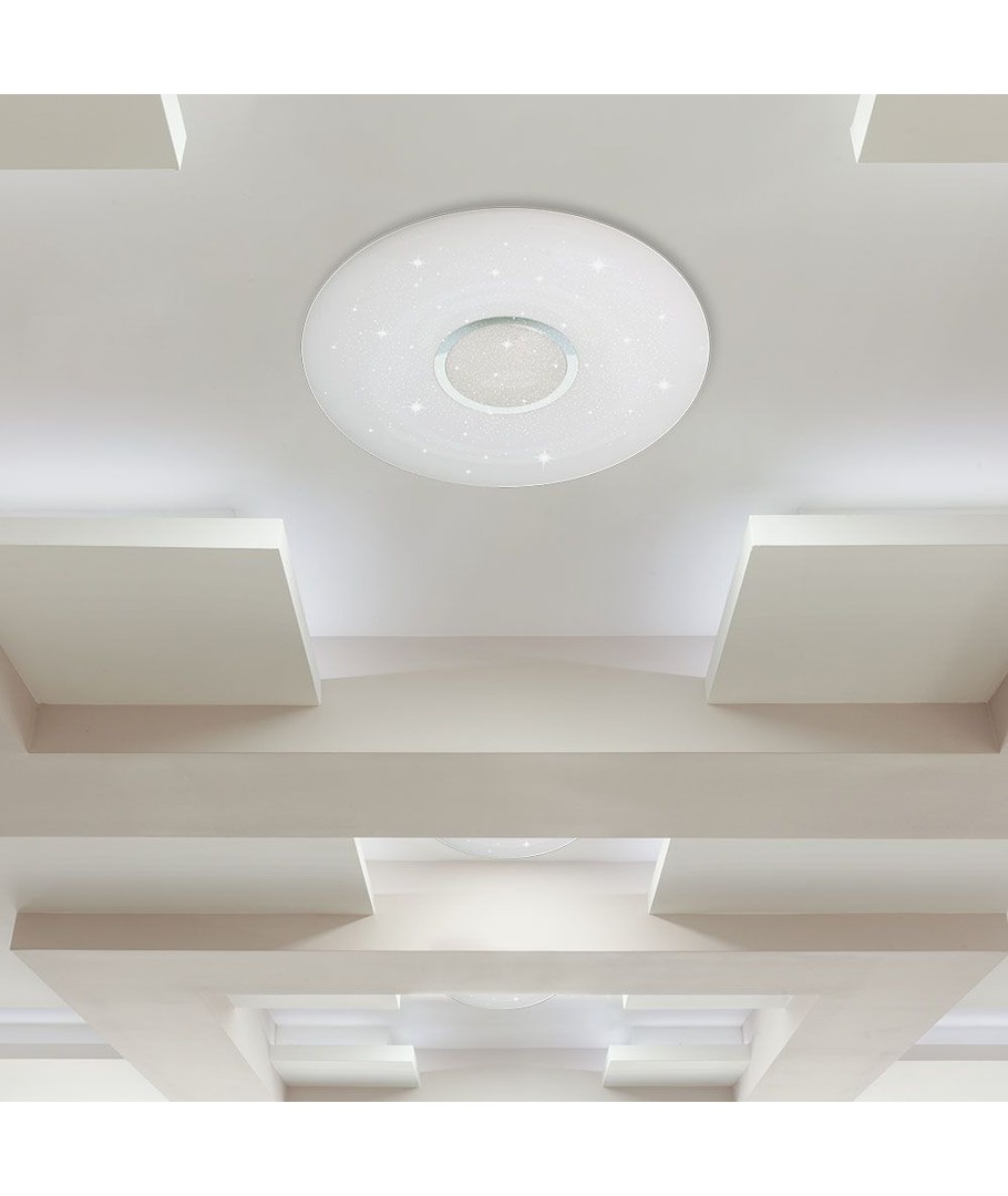 La source lumineuse intégrée assure une haute luminosité avec une répartition impressionnante de la lumière. La forme ronde de la lampe permet à la lumière de se diffuser uniformément, améliorant l'éclairage de la pièce sans créer d'ombres.