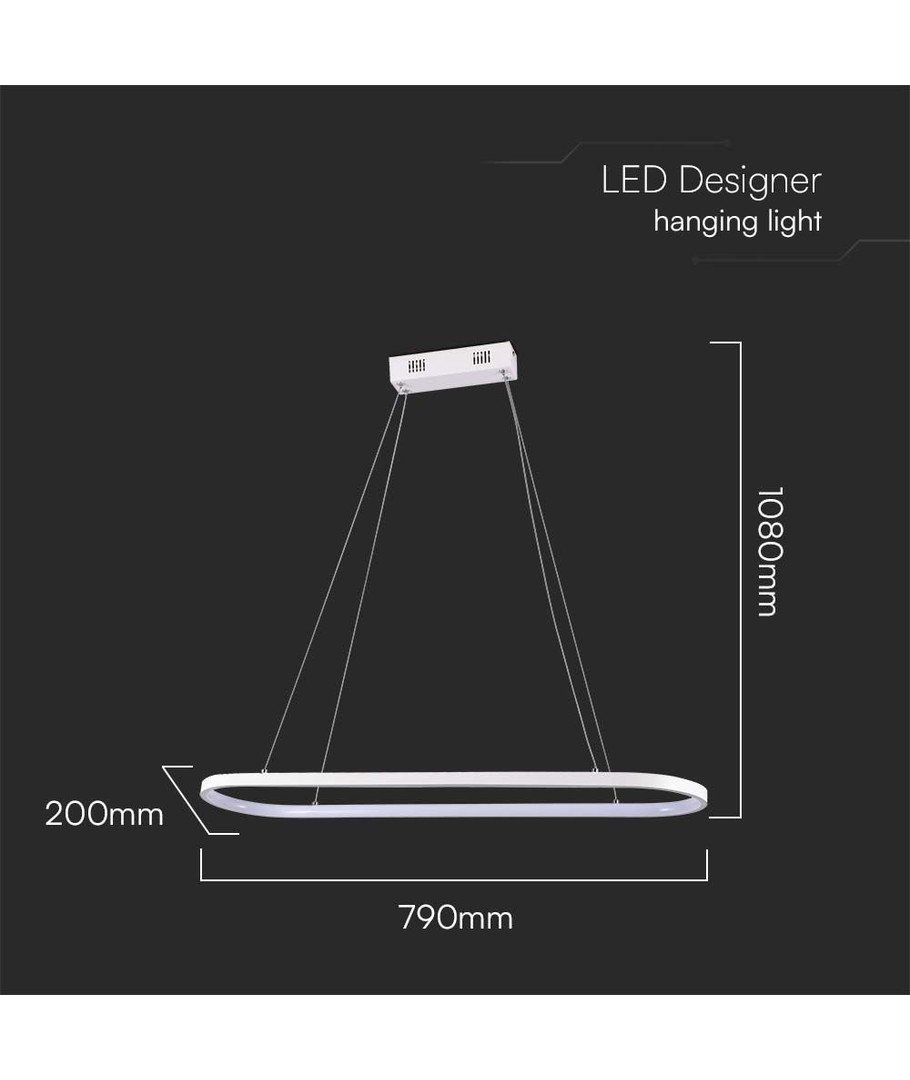 La lampe a des dimensions de 1080 x 200 x 790 mm, ce qui en fait un élément marquant mais élégant dans la pièce. Avec une classification IP20, elle est idéale pour une utilisation intérieure, mais non conçue pour des environnements humides.