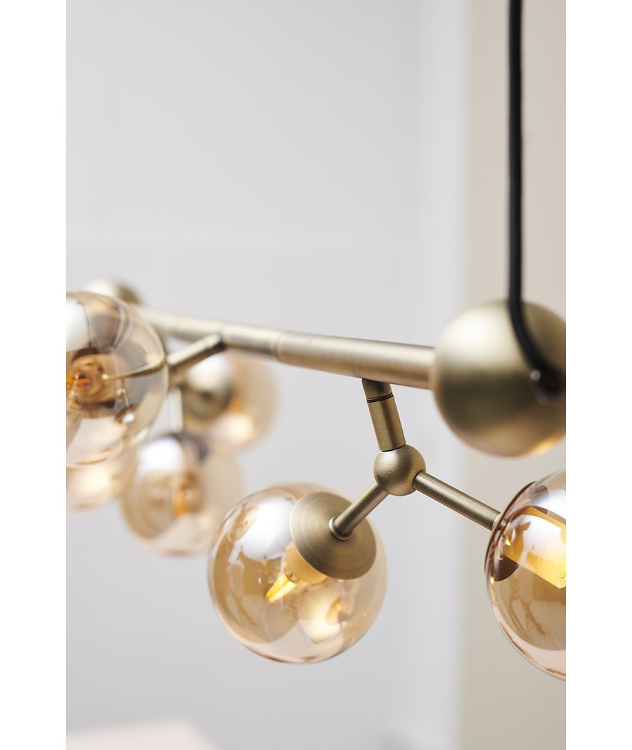 La finition oxydée de la lampe ajoute une touche brute et industrielle qui contraste avec les lignes douces des globes en verre, en faisant un excellent point de rassemblement au-dessus d'une table longue. Avec son style élégant, elle convient aussi bien aux intérieurs modernes que classiques. Les nuances subtiles et la palette de couleurs neutres de la lampe en font un choix polyvalent qui s'intègre dans de nombreux styles de décoration différents.