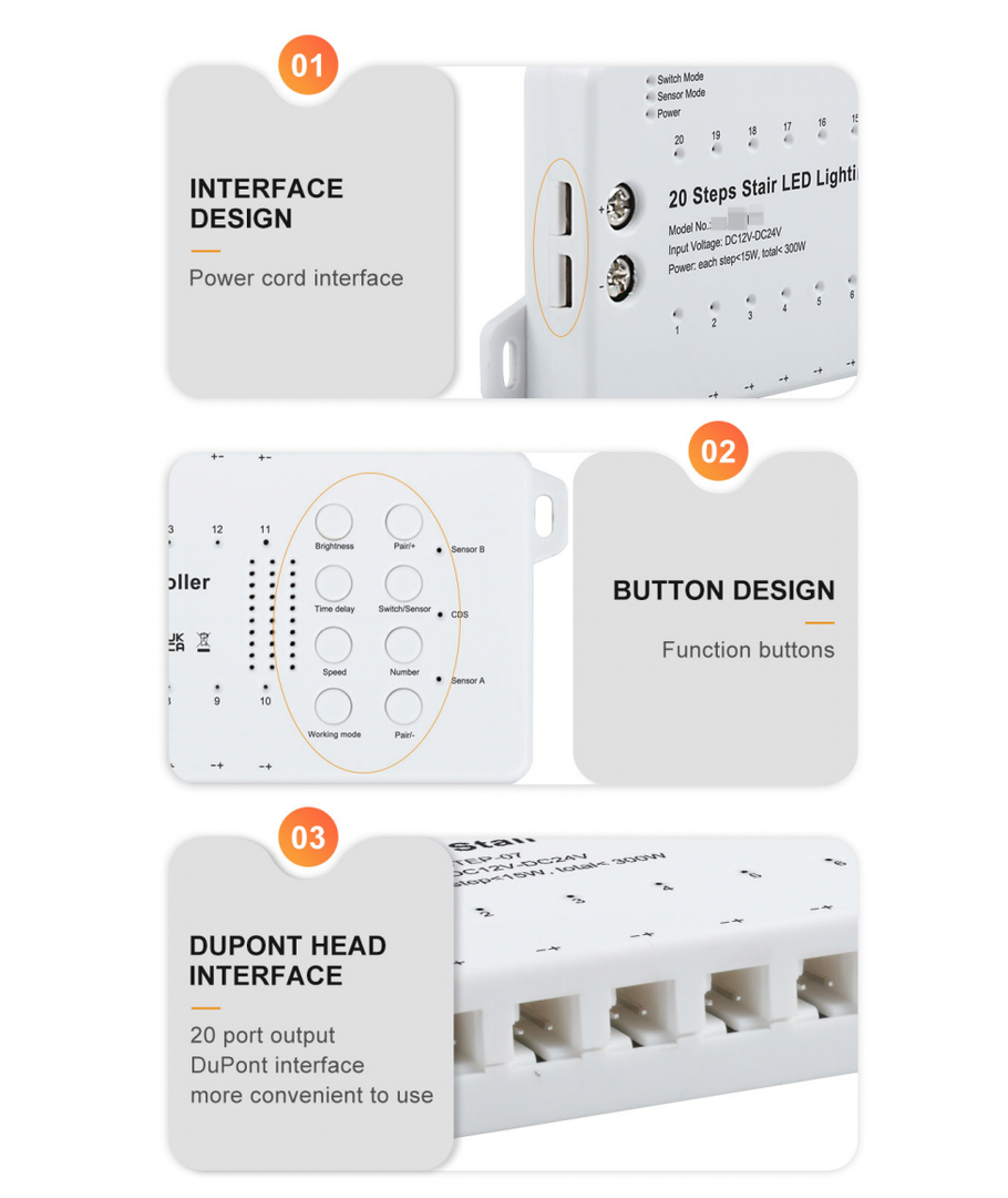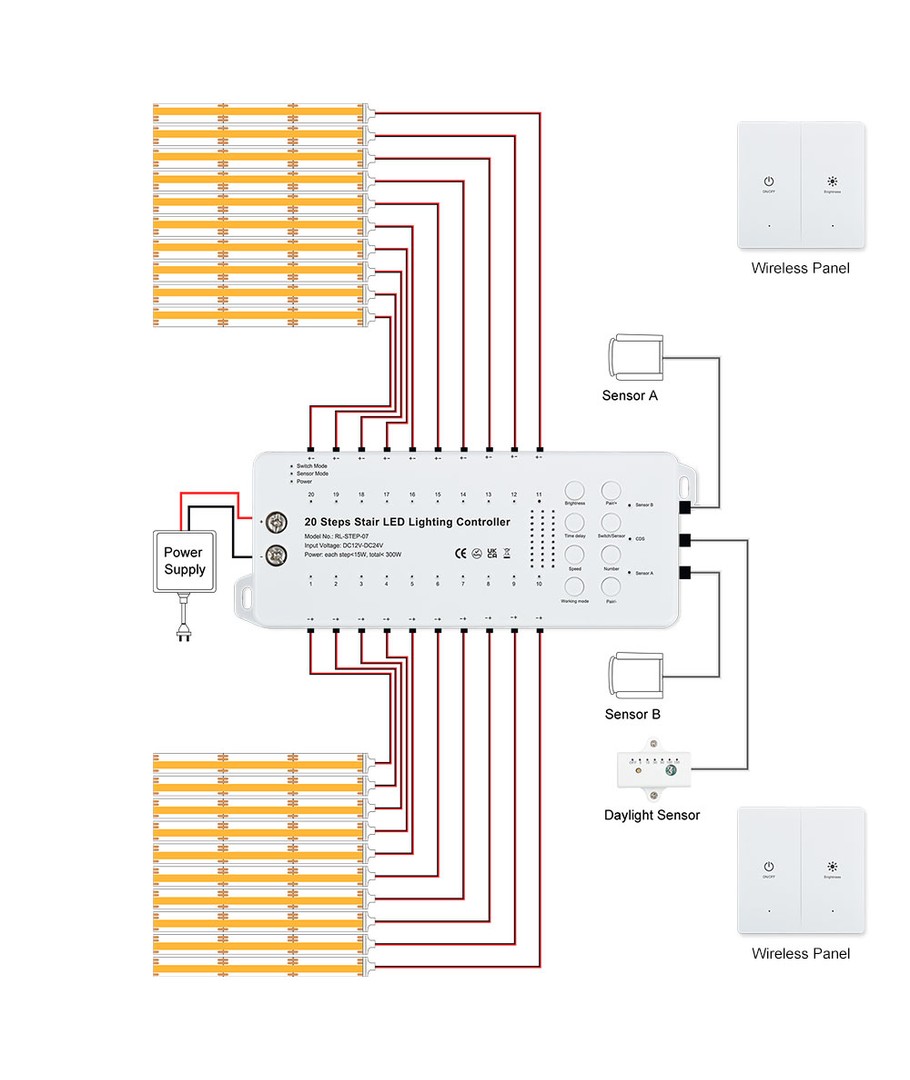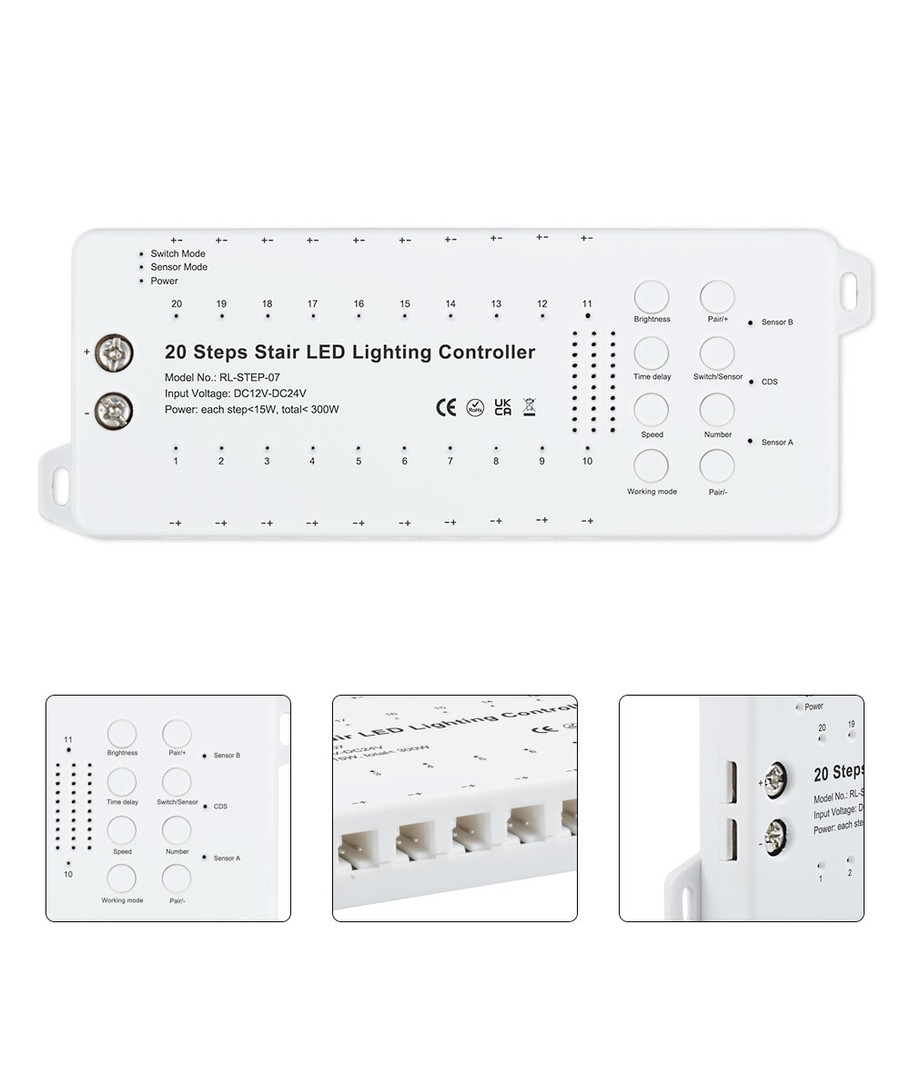• Luminosité : Chaque marche est équipée d'une LED de 11W, garantissant une distribution uniforme de la lumière jusqu'à 20 marches.