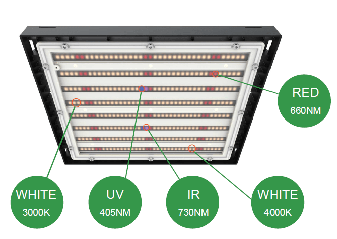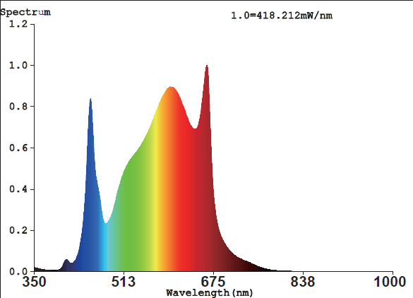 | PAR (valeur centrale) : | 1278 ppfd 30cm 525 ppfd 45cm |