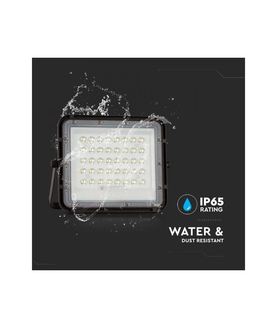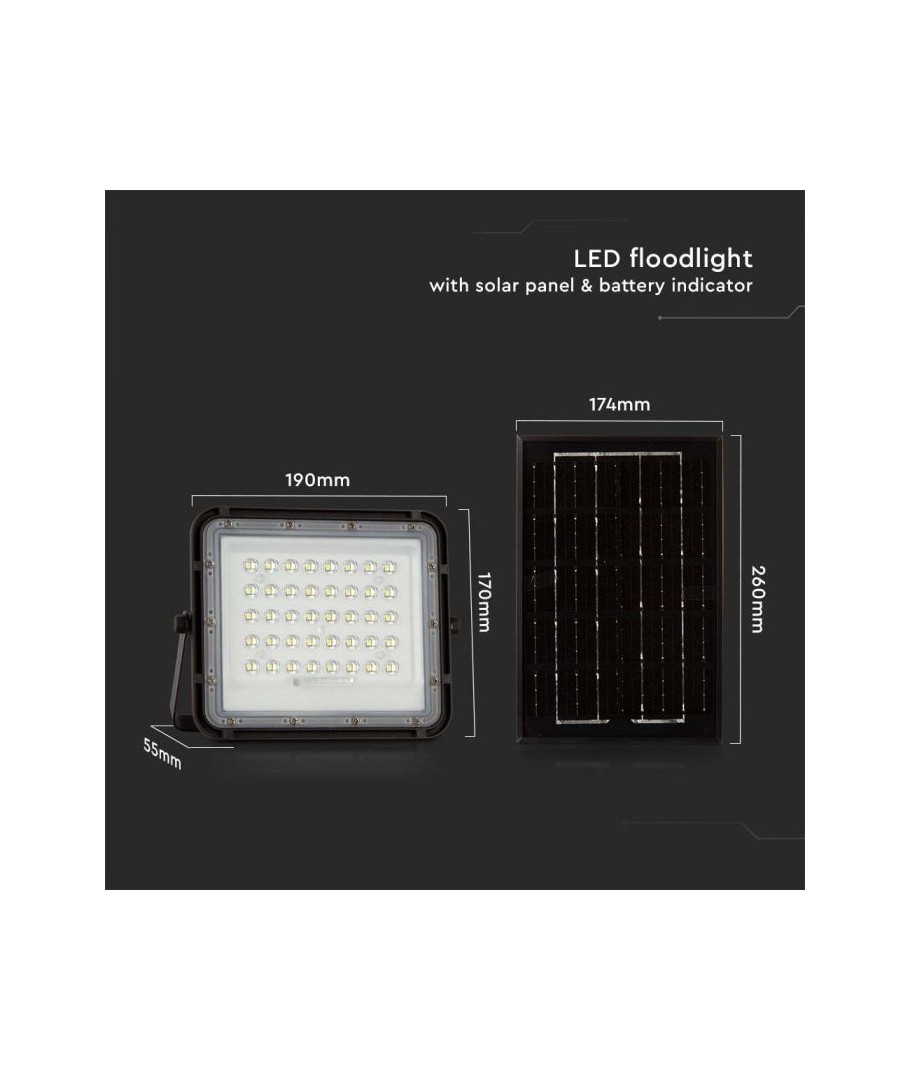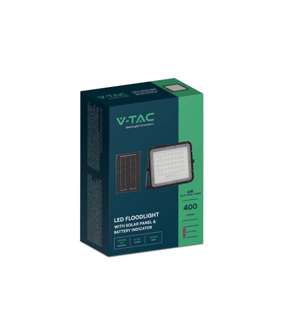 Projecteur solaire LED V-Tac 6W - Noir, une solution pratique et économe en énergie pour l'éclairage extérieur. Ce projecteur comprend un panneau solaire et une télécommande, et est conçu pour résister à toutes les conditions météorologiques grâce à sa classification IP65. Il dispose également d'une fonction minuterie pratique qui vous permet de le programmer pour qu'il s'éteigne automatiquement après une certaine période. Avec un temps de charge complet de seulement 4 à 6 heures, ce projecteur peut fournir 12 heures de lumière. Il est également livré avec un câble de 3 mètres, vous offrant la flexibilité de le placer où vous en avez besoin.