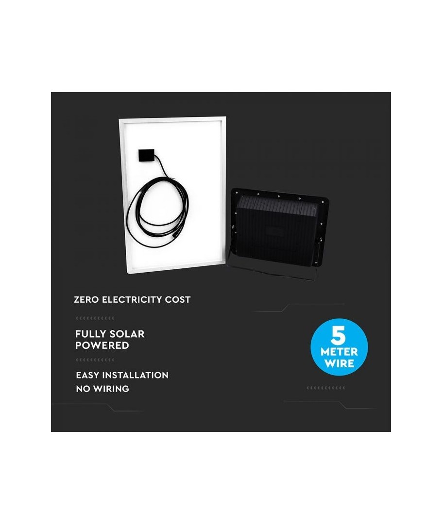 Projecteur LED solaire V-Tac 50W - Noir, une solution pratique et économe en énergie pour l'éclairage extérieur. Ce projecteur comprend un panneau solaire et une télécommande, et est conçu pour résister à toutes les conditions météorologiques grâce à sa classification IP65. Il dispose également d'une fonction minuterie pratique qui vous permet de le programmer pour qu'il s'éteigne automatiquement après une certaine période. Avec un temps de charge complet de seulement 4 heures, ce projecteur peut fournir 8 heures de lumière. Il est également livré avec un câble de 5 mètres, vous offrant la flexibilité de le placer où vous en avez besoin.