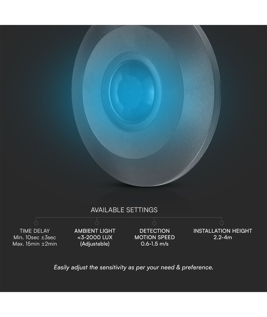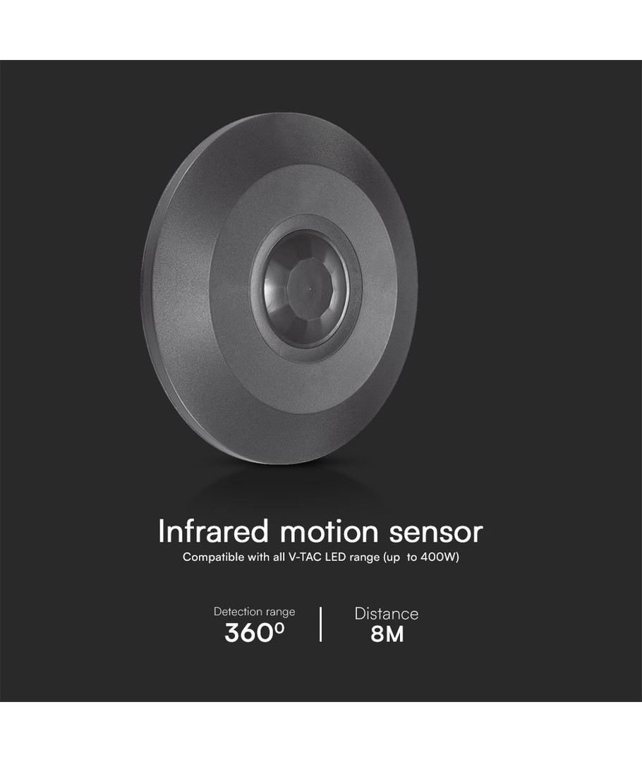 Le capteur de plafond PIR élégant en noir intégral de V-Tac offre une détection avancée à 360 degrés, idéale pour la sécurité et l'efficacité énergétique à la maison ou au bureau.