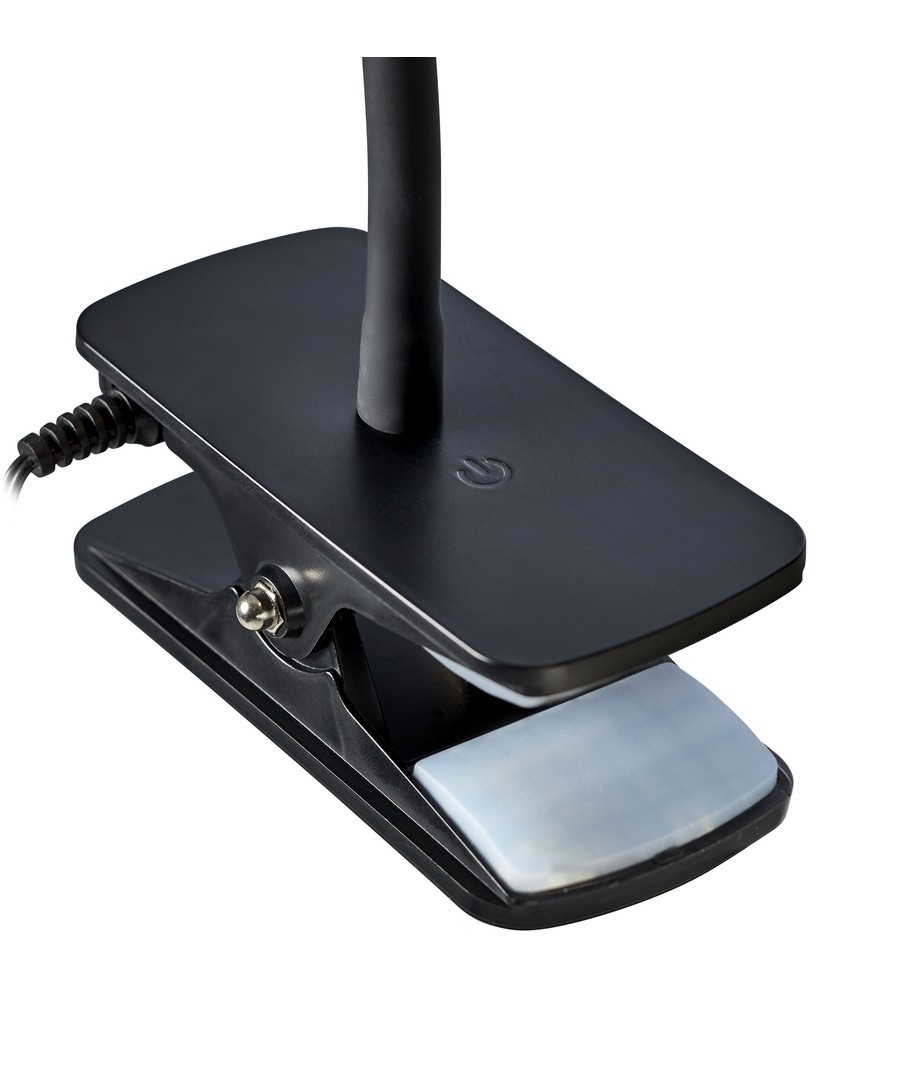Élégante lampe de table inclinable de Nielsen Light, avec un support flexible et une pince pour la fixer sur le côté du bureau.