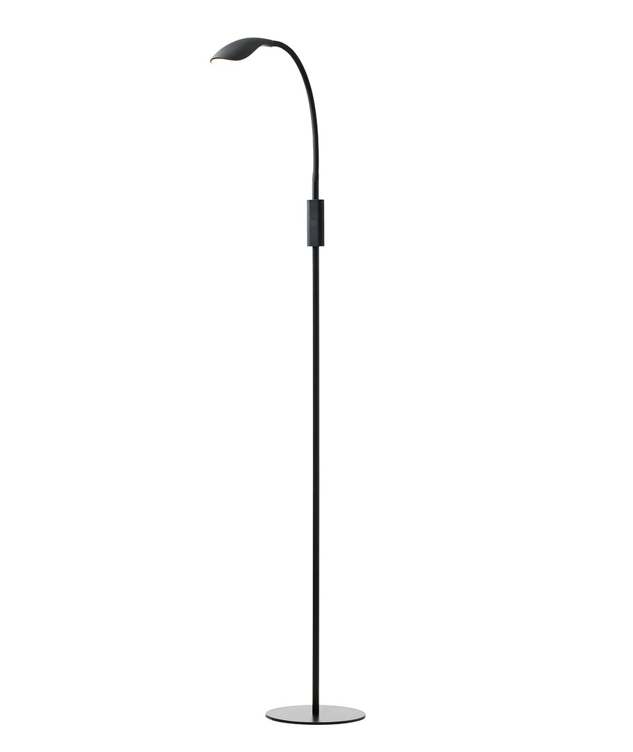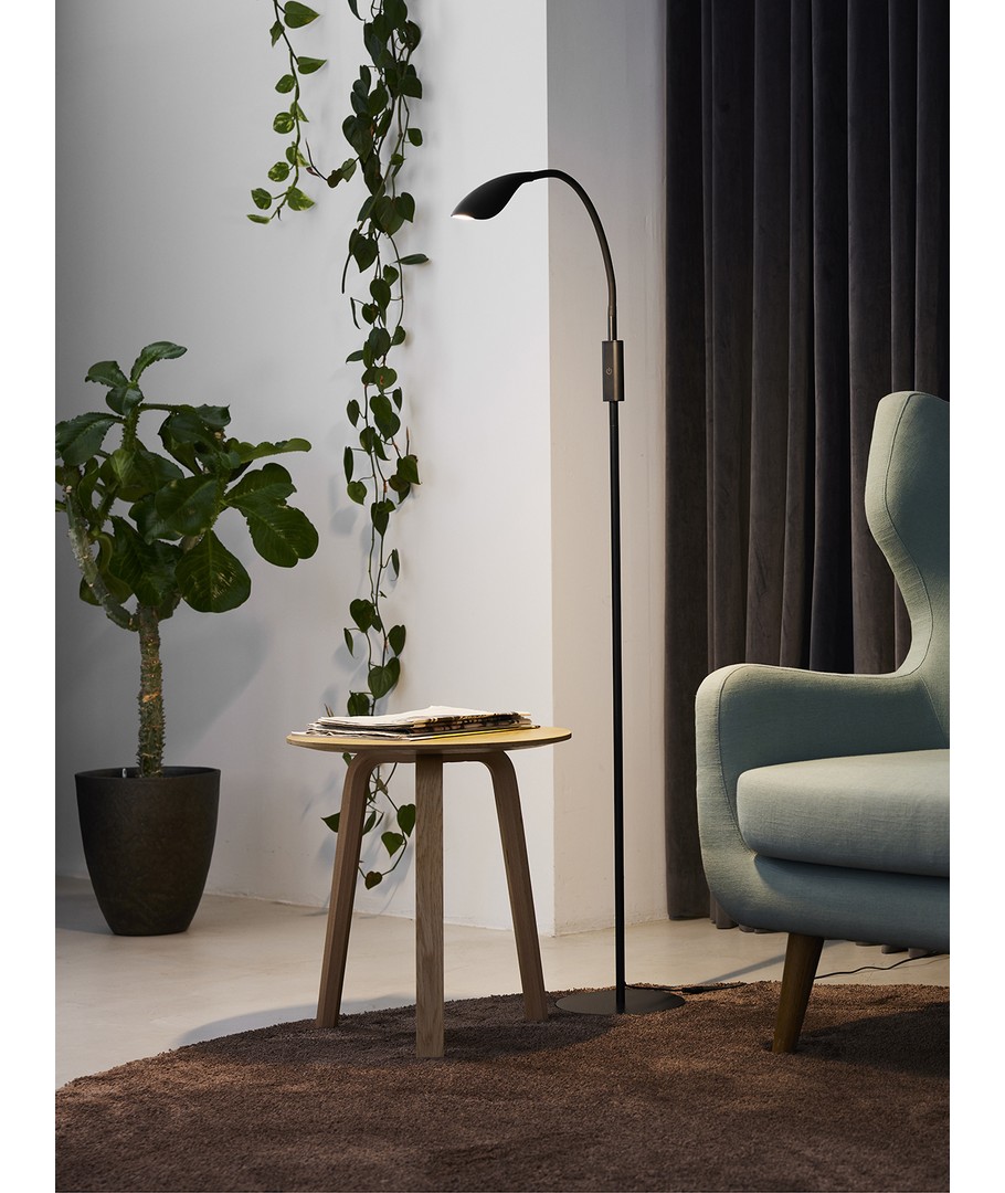 Lampadaire LED noir de Nielsen Light nommé Mamba, au design unique. La lampe dispose d'un variateur Touch intégré sur la tige, ce qui la rend facile à utiliser. L'interrupteur marche/arrêt est situé sur la même commande que le variateur.