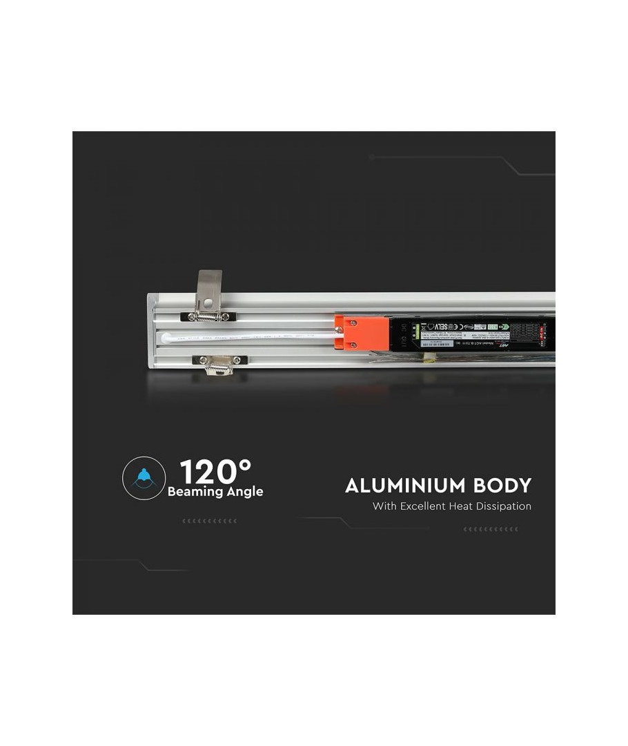 Cette lumière linéaire LED offre une puissance efficace de 40W avec une intensité lumineuse de 3200 lumens, garantissant un éclairage puissant et uniforme. Sa large diffusion de 120 degrés assure une répartition parfaite de la lumière dans votre pièce.