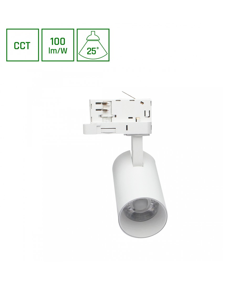 Avec une puissance de 8W et une connexion à une alimentation 230V, ce spot sur rail est à la fois économe en énergie et facile à installer. La luminosité atteint 600 lumens, fournissant une lumière forte et concentrée qui se diffuse sur 25 degrés. Ce design assure une émission lumineuse contrôlée et précise, répondant aux besoins pratiques et esthétiques.
