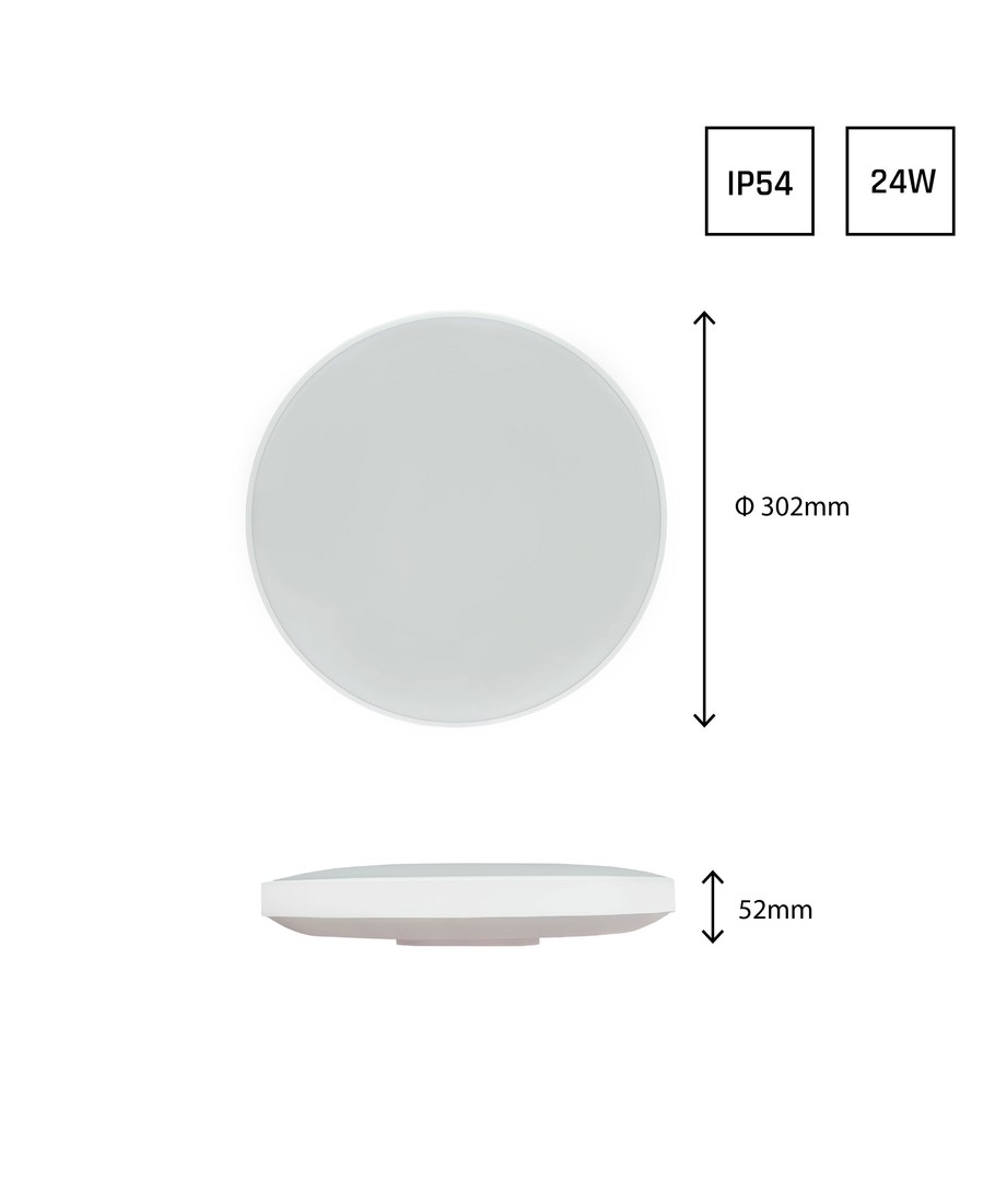Avec une classification IP54, la lampe NYMPHEA 24W est conçue pour résister à l'air humide et aux éclaboussures d'eau sur la face avant, ce qui la rend adaptée à une utilisation dans les salles de bains et autres zones où l'humidité peut être présente.