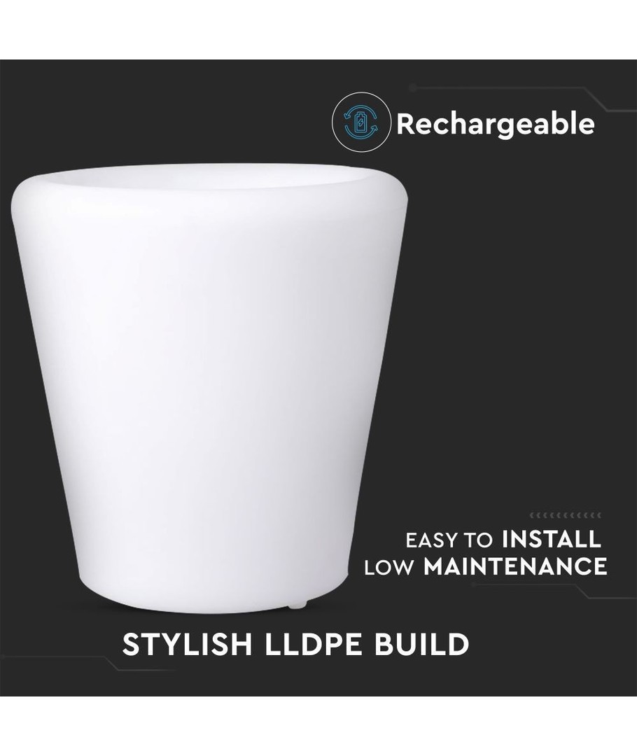 Le polyvalent cache-pot LED RGB V-Tac est idéal pour diverses utilisations. Utilisez-le pour décorer et illuminer des espaces de rangement ou comme veilleuse élégante. Il est aussi parfait pour les occasions festives ou comme élément d'ambiance sur la table à dîner.