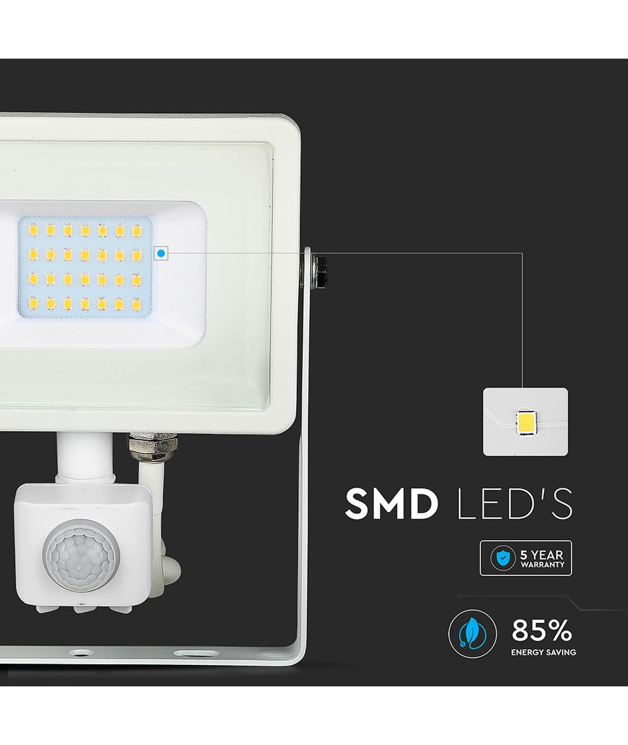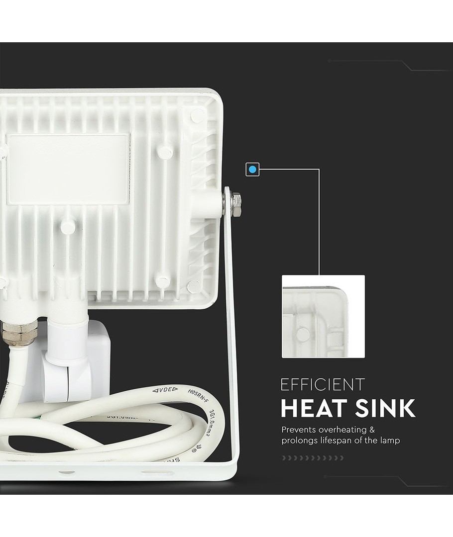 Le projecteur est livré dans un boîtier blanc et possède une classification IP65, ce qui signifie qu'il est adapté à un usage extérieur et peut résister aux éclaboussures d'eau et à la pluie. Cela garantit que le projecteur est à la fois fonctionnel et durable dans toutes les conditions météorologiques.