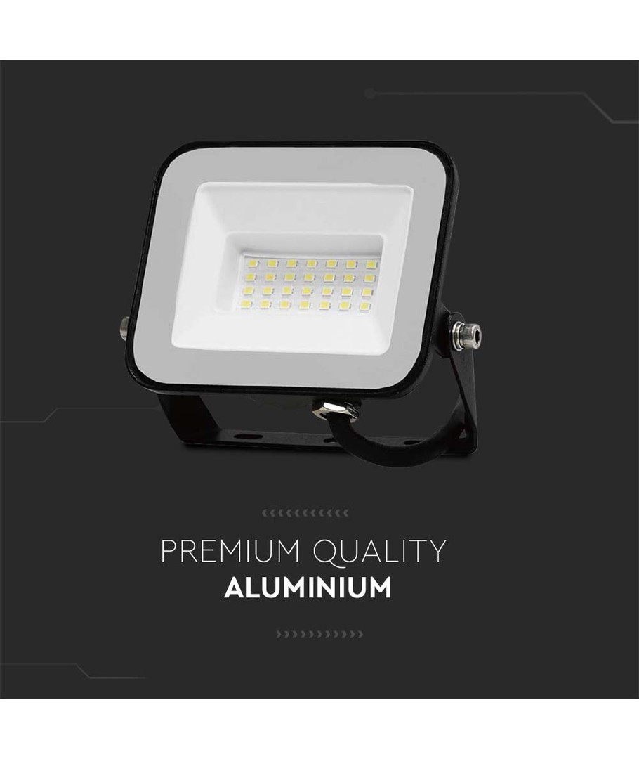 Le projecteur possède un boîtier robuste noir avec verre gris, ajoutant une touche moderne au design, tout en étant résistant aux intempéries grâce à sa classification IP65. Cela signifie qu'il peut résister aux éclaboussures d'eau et à la pluie, ce qui le rend idéal pour une installation en extérieur.