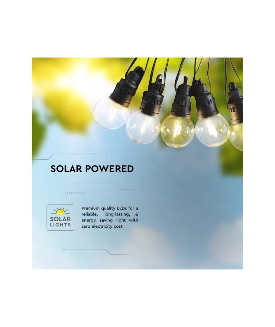 La guirlande lumineuse solaire V-Tac avec 10 ampoules est la solution idéale pour ceux qui recherchent une manière polyvalente, pratique et élégante d'éclairer leur maison, jardin ou événement. Avec sa facilité d'utilisation et sa durabilité, c'est un investissement qui répond à la fois aux besoins esthétiques et fonctionnels.