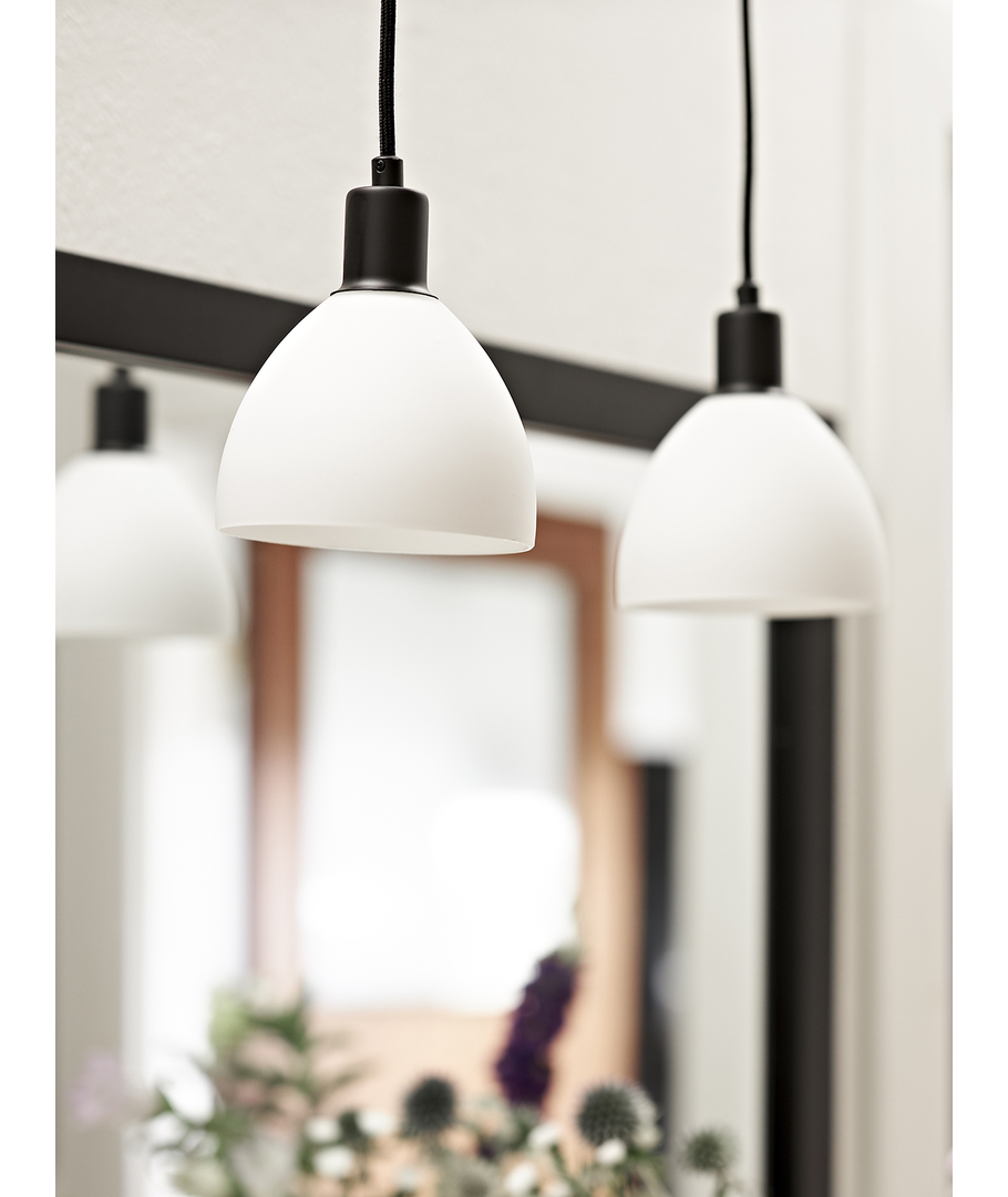 2 suspensions en verre opale avec douilles noir mat suspendues par un câble textile noir.