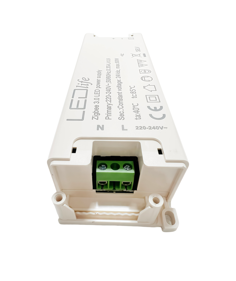 Cette alimentation 60W est conçue pour ceux qui souhaitent intégrer leur éclairage LED avec des systèmes Zigbee, y compris des configurations compatibles Hue. Pour faciliter une installation simple et sans souci, l'appareil se connecte directement à votre alimentation 230V et fournit un courant stable de 24V DC.