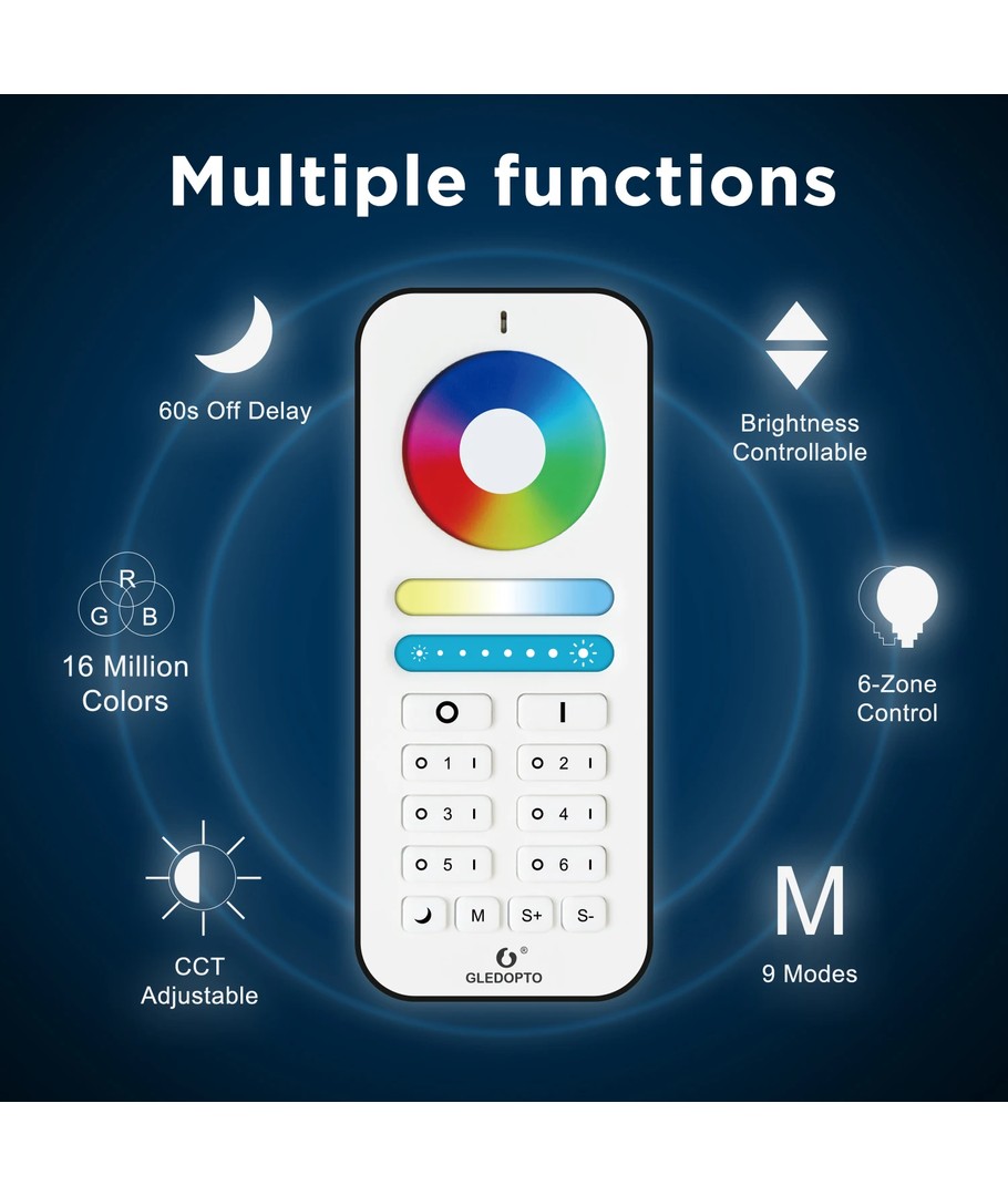 Découvrez la flexibilité et le contrôle ultimes avec la télécommande tactile Gledopto 6 zones RGB+CCT - conçue pour vous offrir une expérience lumineuse fluide jusqu'à 6 zones sans besoin de hub Zigbee.