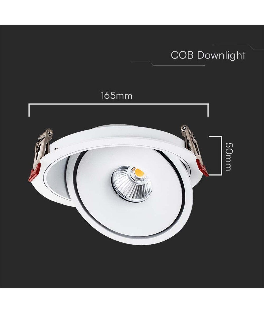 Spotten har kompakte dimensioner på 50 mm x Ø165 mm og kræver en udskæringshulstørrelse på 150 mm for korrekt installation. Bemærk, at dette produkt har en IP20 værdi, hvilket betyder, at det ikke er vandtæt og derfor mest egnet til tørre rum.