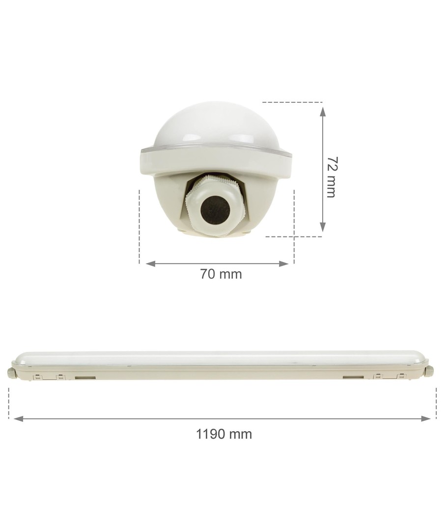 Med en kompakt størrelse på 1250 x 72 x 70 mm passer armaturet problemfrit ind i ethvert miljø, hvor pladsoptimering er vigtig.