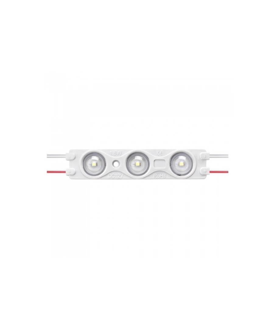 Dette LED modul er en optimal løsning til skilte og specialløsninger, som kræver effektiv og jævn belysning. Modulet har en effekt på 1.5W og tilsluttes nemt til en 12V DC forsyning. Med en lysstyrke på 120-150 lumens og en høj spredning på 120 grader, får du en fantastisk jævn lysfordeling.