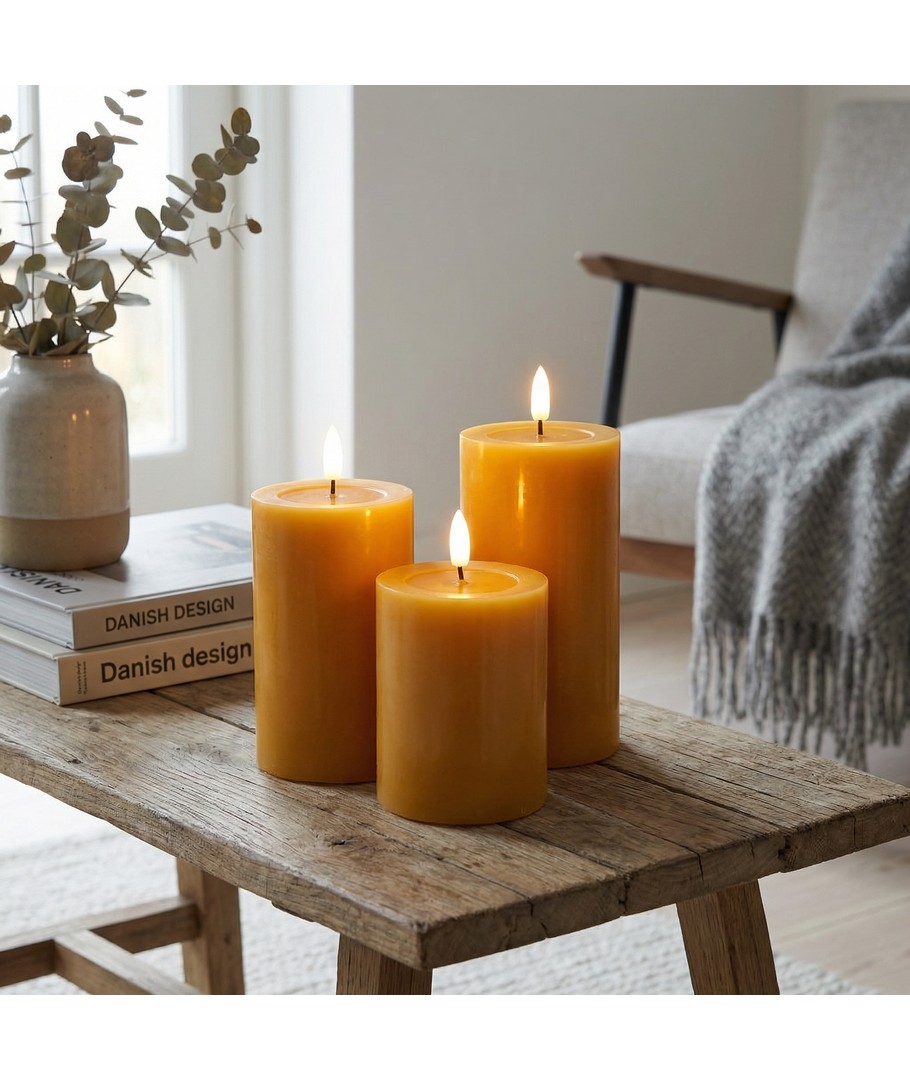 Oplev en magisk atmosfære i dit hjem med vores LED Bloklys sæt, der kombinerer skønheden af ægte stearin med moderne teknologi for at skabe en naturtro flammeeffekt.