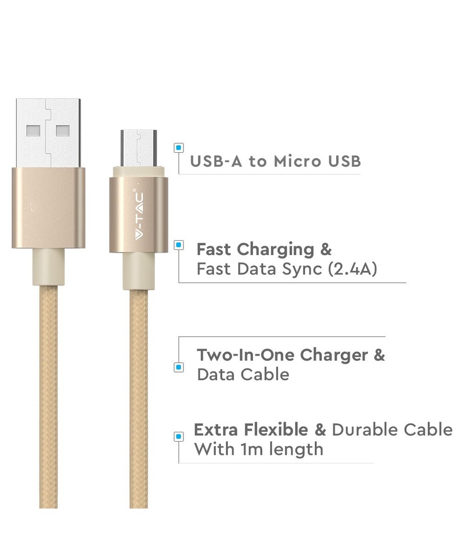 Dette guld farvede MicroUSB stofkabel er den ideelle kombination af funktionalitet og æstetik, og vil være et værdifuldt tilbehør til din daglige brug.