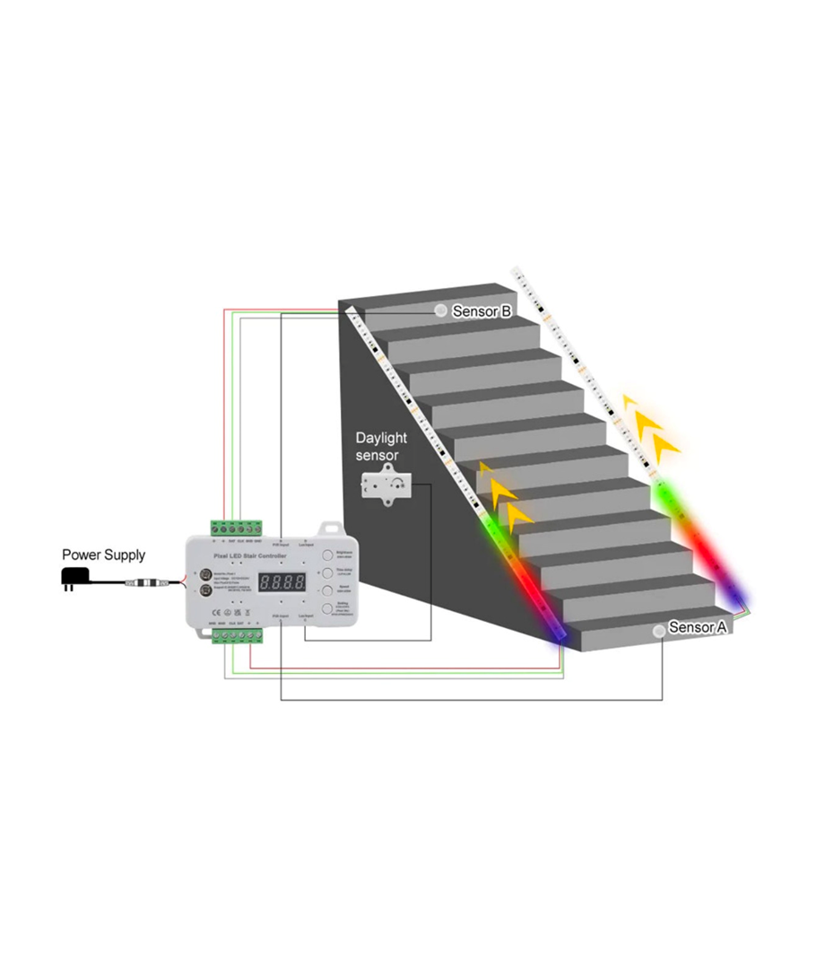 Dit intelligente besturingscentrum geeft u volledige controle over uw trapverlichting. Pas verlichtingspatronen en lichtsterkte eenvoudig aan met de meegeleverde sensor.