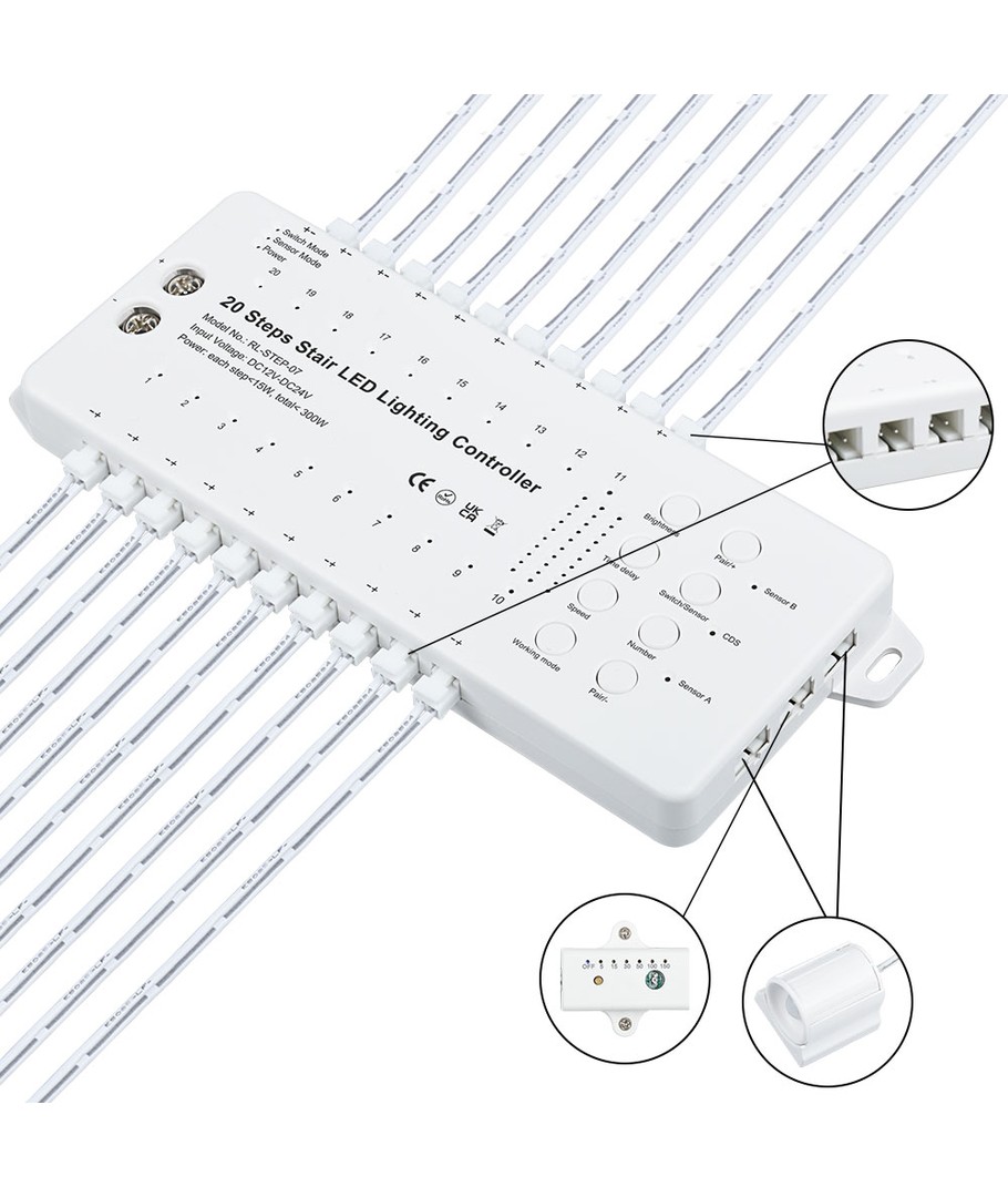De 2 PIR-sensoren worden aan elk uiteinde van de trap geplaatst, zodat het licht aangaat wanneer je de trap op of af loopt. Er kunnen effecten worden gemaakt op basis van welke sensor wordt geactiveerd.