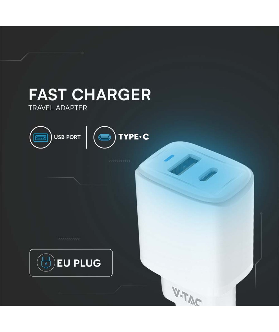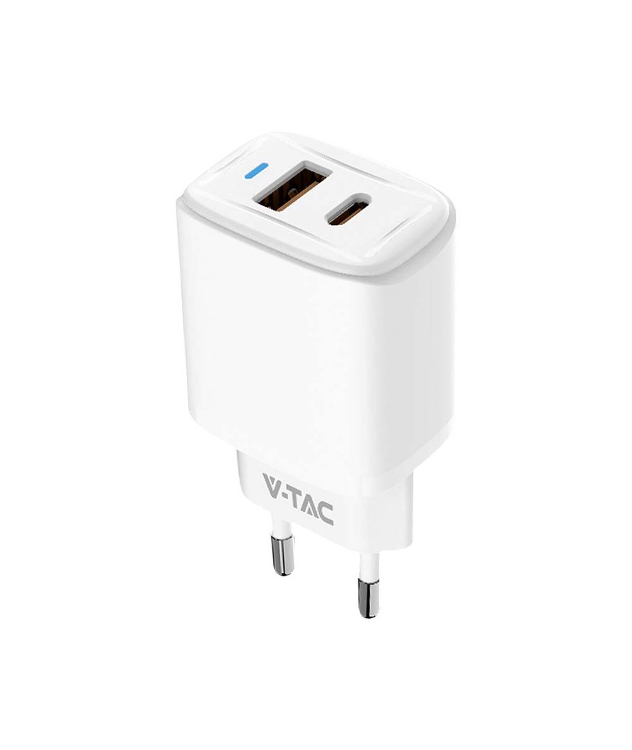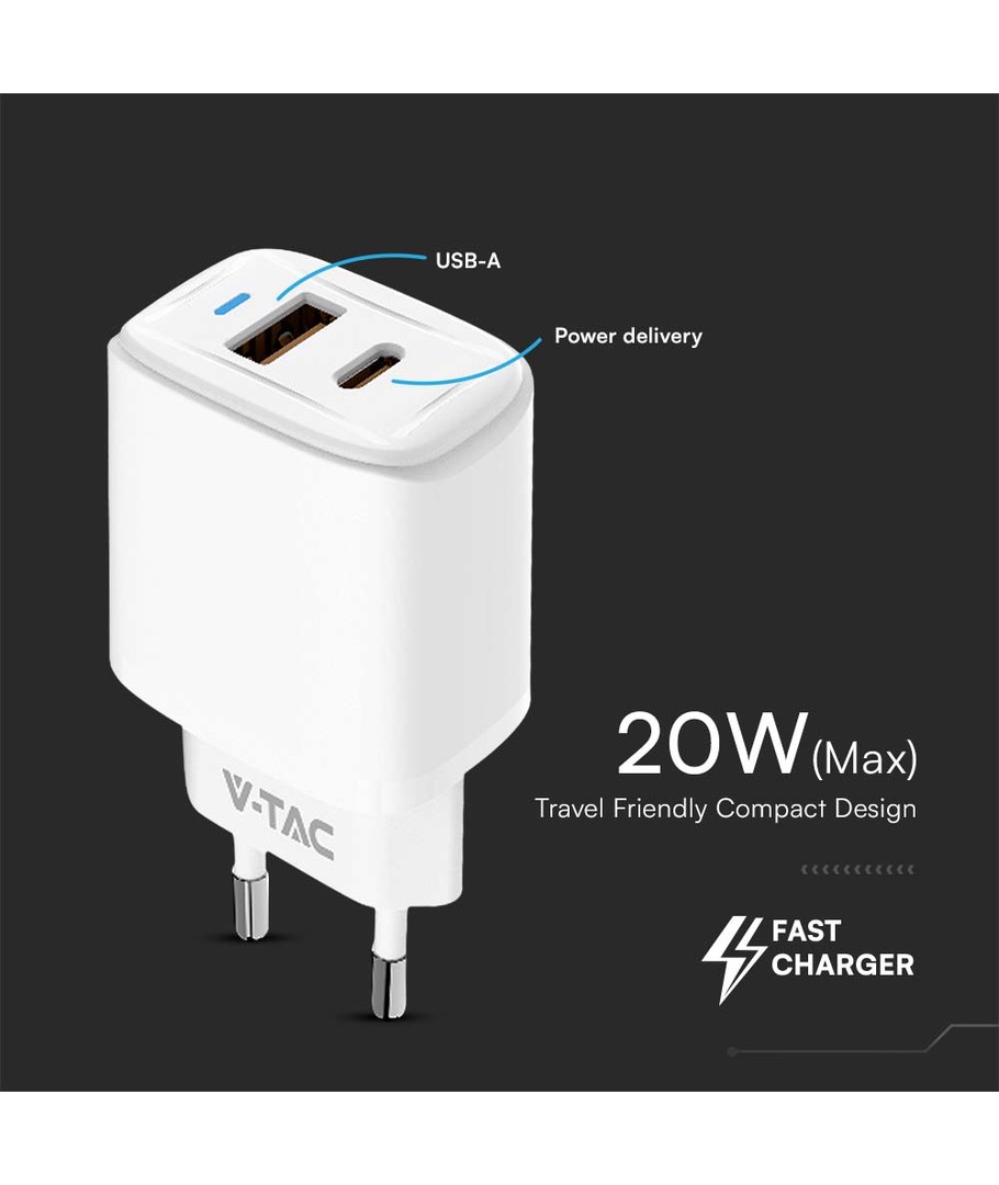 20W Travel Adapter met PD en QC - Wit, 1x PD poort, 1x QC poort V-TAC Uitklappen