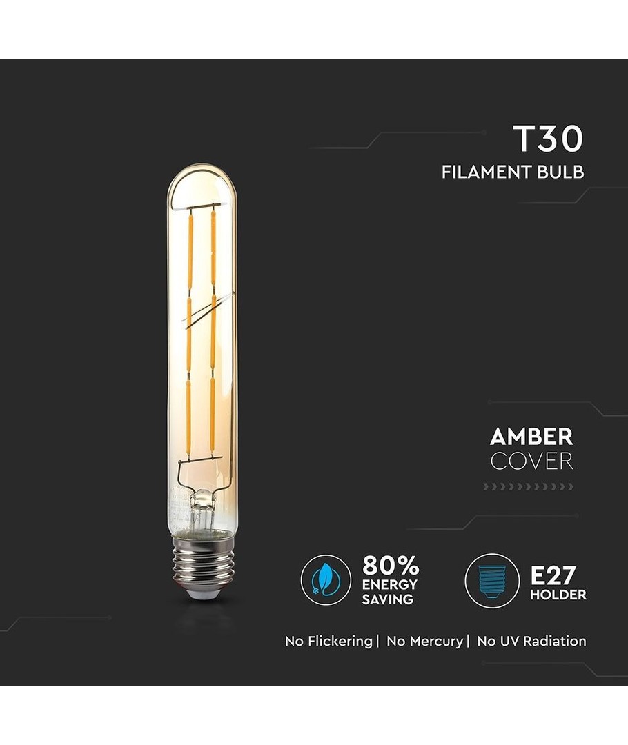 De afmetingen van de lamp zijn 30 x 185 mm, wat hem tot een stijlvolle toevoeging maakt die in veel soorten lampen past. Het slanke T30 ontwerp geeft hem een moderne uitstraling, terwijl de zichtbare kooldraden een klassieke elegantie toevoegen.