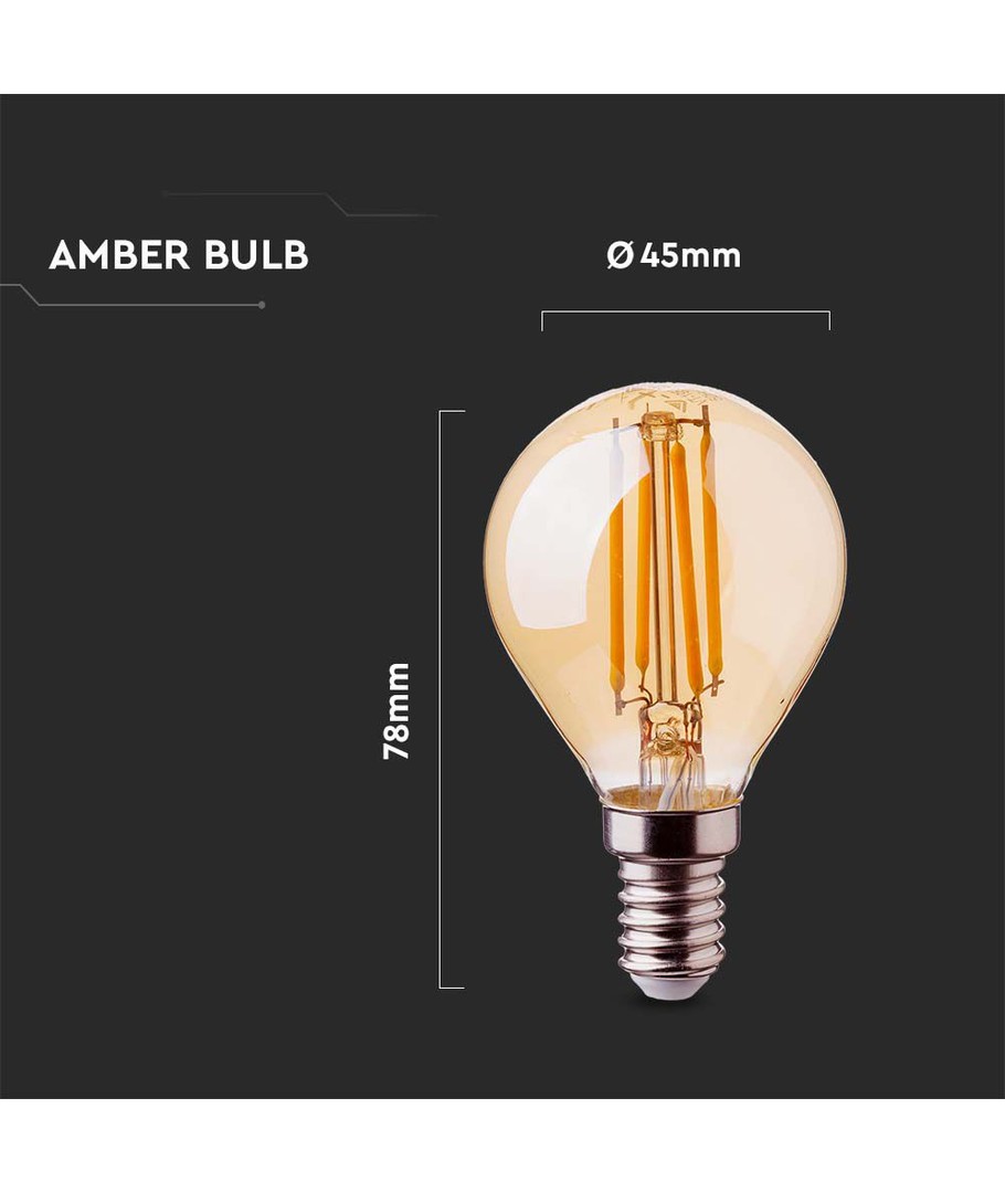 Ervaar de perfecte combinatie van moderne technologie en klassiek design met deze 4W P45 lamp met E14 kleine fitting. De karakteristieke amber kap en het bijzondere gloeidraadontwerp zorgen voor een extra warm licht dat doet denken aan de ouderwetse gloeilampen.