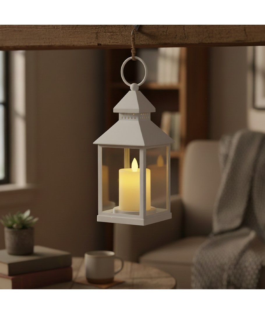 LED lantaarn met vlam-effect in wit voor zowel binnen- als buitengebruik.