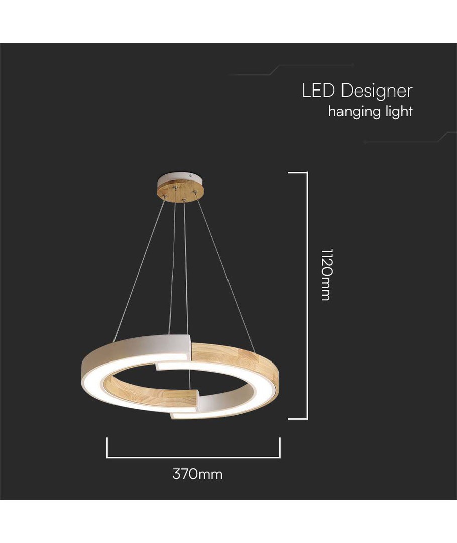De afmetingen van 1120 x 370 x 430 mm geven de lamp een opvallende aanwezigheid zonder de ruimte te overheersen. De elegante combinatie van wit en hout geeft een tijdloze uitstraling die in veel verschillende interieurstijlen past.