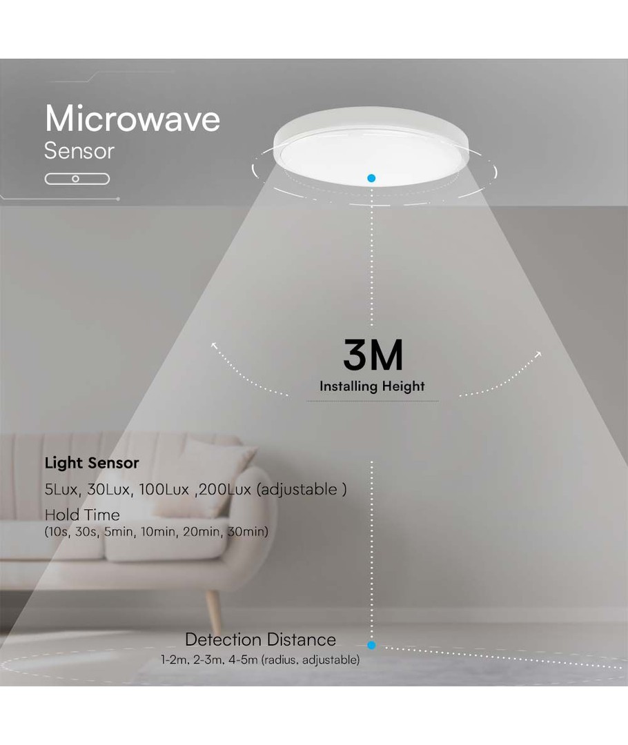 AfmetingenDe ingebouwde microgolf sensor verhoogt het gebruiksgemak en de energie-efficiëntie door het licht automatisch aan en uit te schakelen op basis van beweging binnen het bereik. Dit zorgt ervoor dat het licht alleen brandt wanneer nodig, wat energie bespaart en de levensduur van het product verlengt.