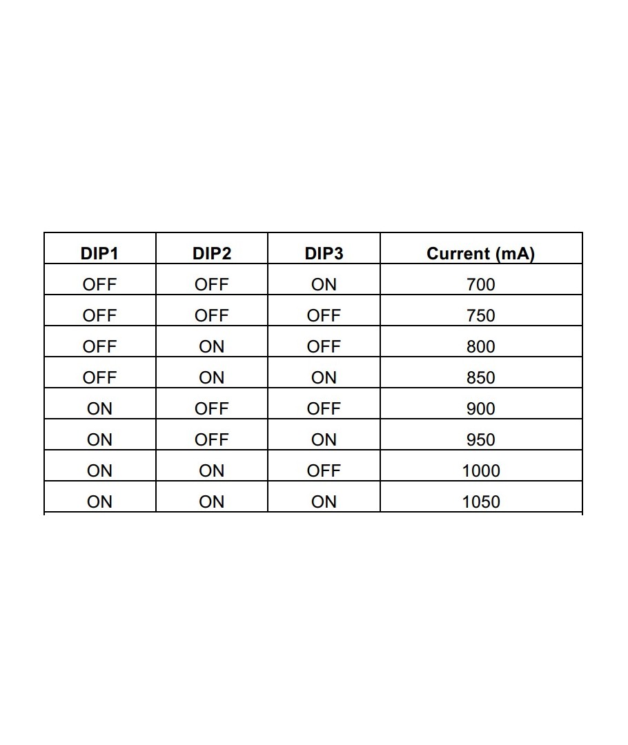 Kan worden aangepast aan een breed scala aan stroomoutput, van 700mA tot 1050mA, zie onderstaande tabel.