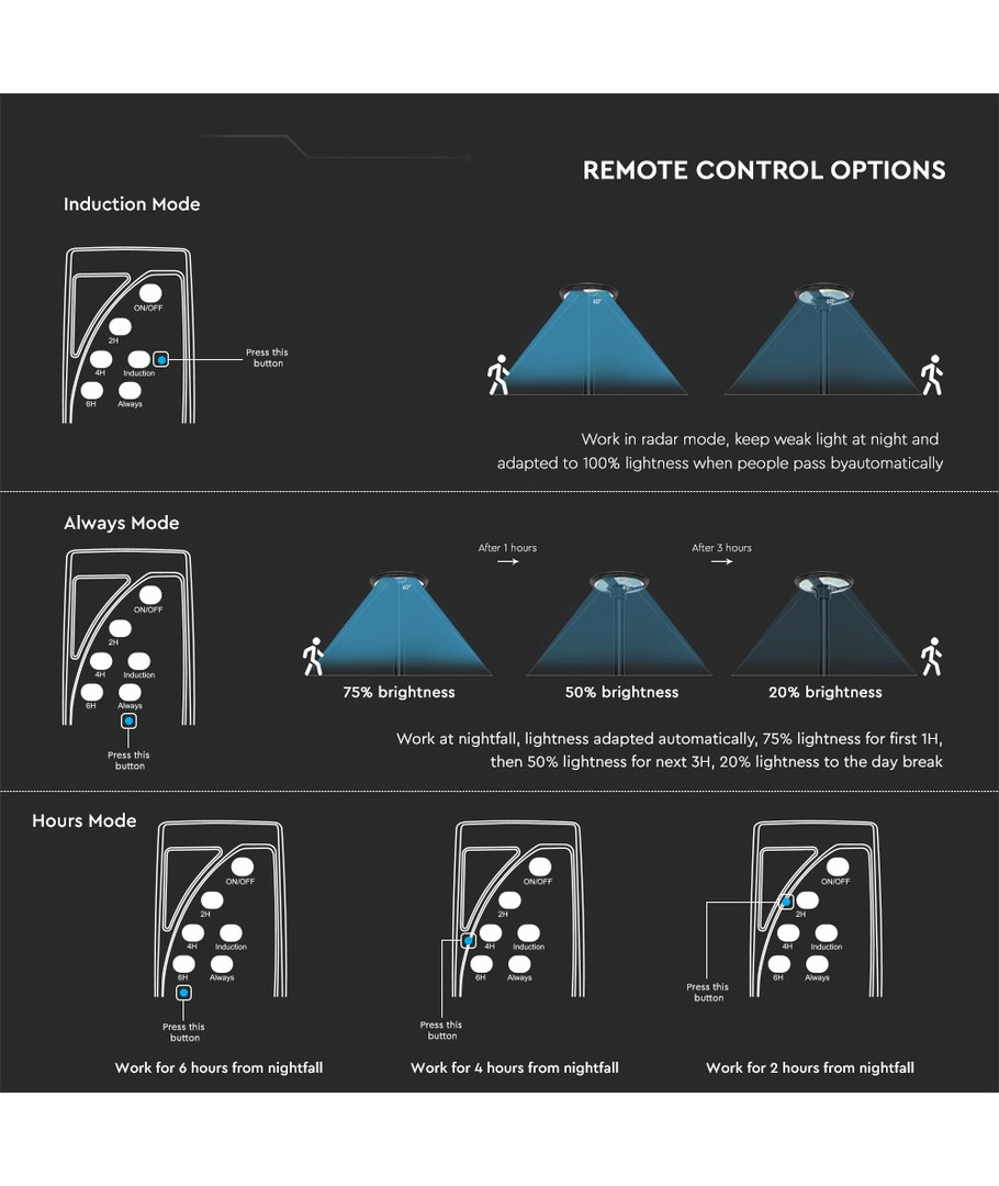 | Aanvullende opmerkingen | Battery: LiFePO4 3.2V 32650, 25AH. Charging time: 6-8 Hours. Working time: 10-12 Hours. Sensor type: Radar Sensor. Sensor angle: 120°. Sensor distance: |