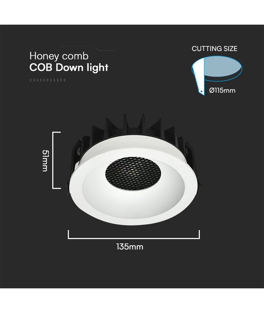 Verstelbaar in drie verschillende lichtkleuren (3000K, 4000K, 6400K), past deze downlight zich perfect aan verschillende sferen en behoeften aan. Hij is zowel praktisch als elegant met een modern honingraatdesign dat het risico op verblinding minimaliseert.
