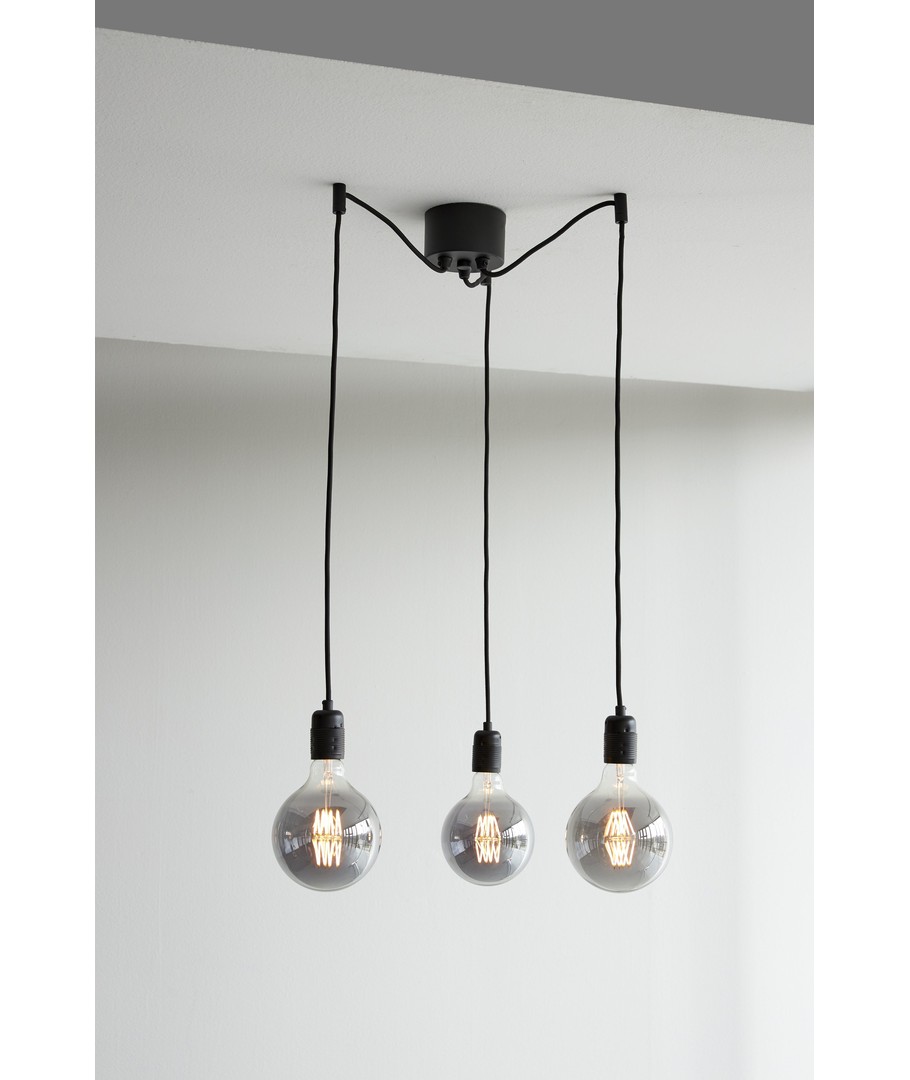 De 5 individuele fittingen hangen aan de plafondkap met elk een eigen prachtig zwart stoffen snoer van 2,5 meter.