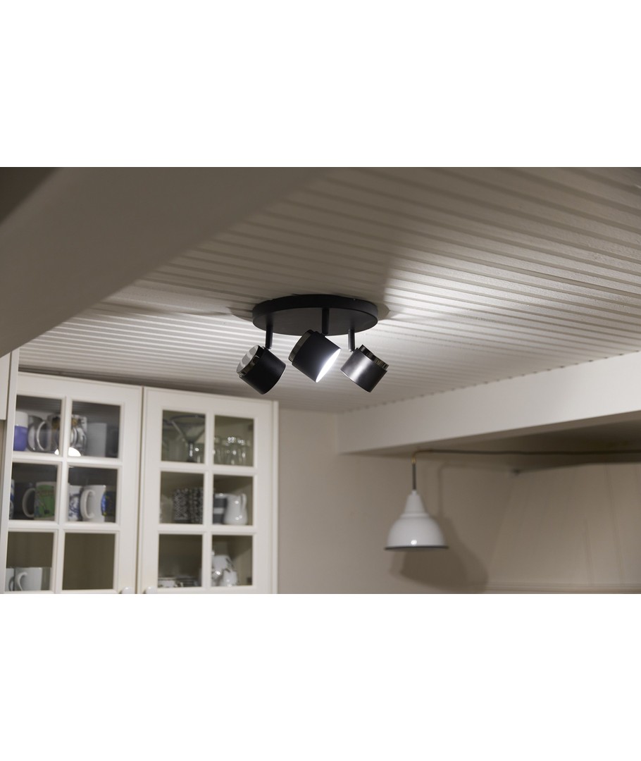 Teater is de naam van deze nieuwe spot-serie van het Deense Nielsen Light - mooie 3-spot in een stijlvolle matzwarte kleur, gerangschikt in een cirkel op een ronde plaat.